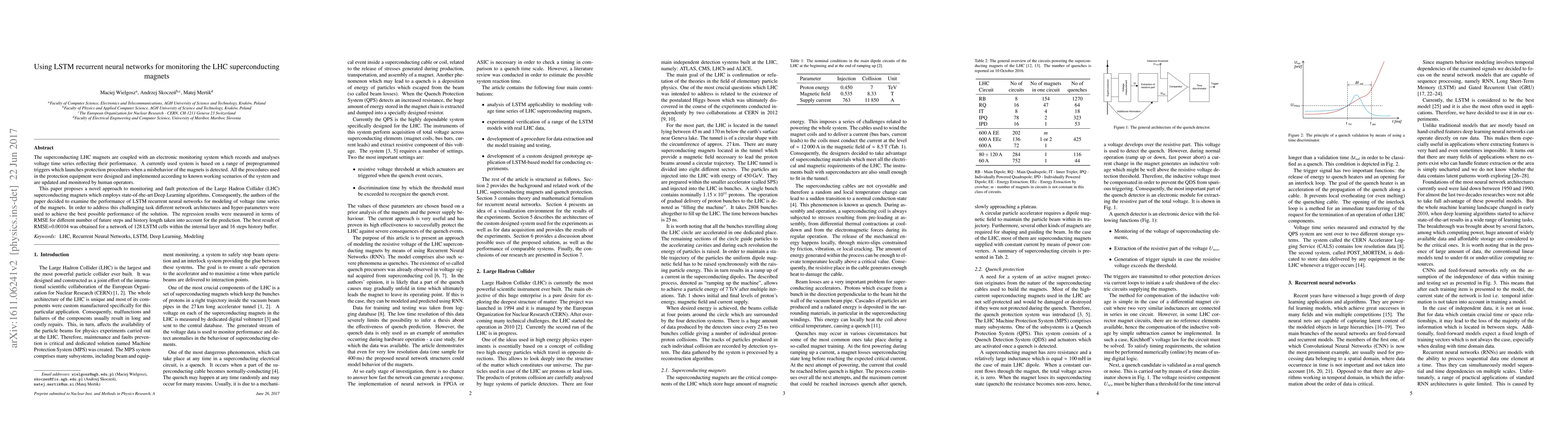 The superconducting LHC magnets are coupled with an electronic monitoring system which records and analyses voltage time series reflecting their performance. A currently used system is based on a range of preprogrammed triggers which launches protection procedures when a misbehavior of the magnets is detected. All the procedures used in the protection equipment were designed and implemented according to known working scenarios of the system and are updated and monitored by human operators. This paper proposes a novel approach to monitoring and fault protection of the Large Hadron Collider (LHC) superconducting magnets which employs state-of-the-art Deep Learning algorithms. Consequently, the authors of the paper decided to examine the performance of LSTM recurrent neural networks for modeling of voltage time series of the magnets. In order to address this challenging task different network architectures and hyper-parameters were used to achieve the best possible performance of the solution. The regression results were measured in terms of RMSE for different number of future steps and history length taken into account for the prediction. The best result of RMSE=0.00104 was obtained for a network of 128 LSTM cells within the internal layer and 16 steps history buffer.