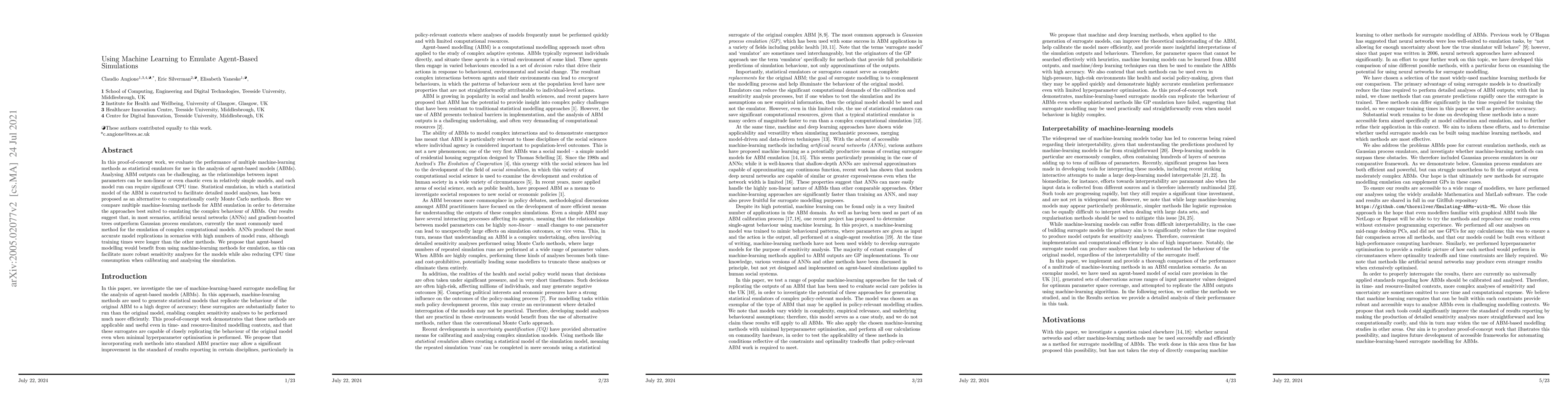 This paper evaluates machine learning methods, particularly artificial neural networks and gradient-boosted trees, as statistical emulators for agent-based models, finding they outperform traditional Gaussian processes in emulating complex model behaviors. The study suggests machine learning can reduce computational costs and facilitate more robust sensitivity analyses.