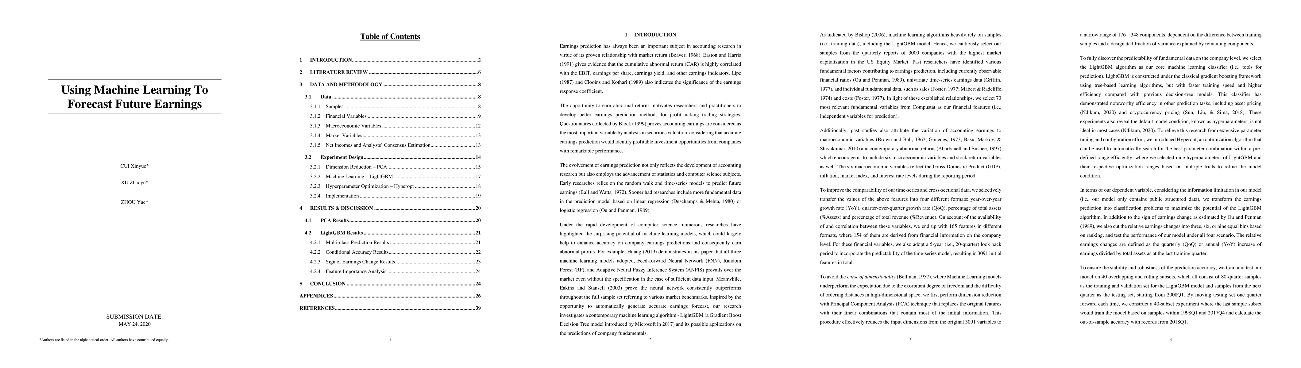 In this essay, we have comprehensively evaluated the feasibility and suitability of adopting the Machine Learning Models on the forecast of corporation fundamentals (i.e. the earnings), where the prediction results of our method have been thoroughly compared with both analysts' consensus estimation and traditional statistical models. As a result, our model has already been proved to be capable of serving as a favorable auxiliary tool for analysts to conduct better predictions on company fundamentals. Compared with previous traditional statistical models being widely adopted in the industry like Logistic Regression, our method has already achieved satisfactory advancement on both the prediction accuracy and speed. Meanwhile, we are also confident enough that there are still vast potentialities for this model to evolve, where we do hope that in the near future, the machine learning model could generate even better performances compared with professional analysts.