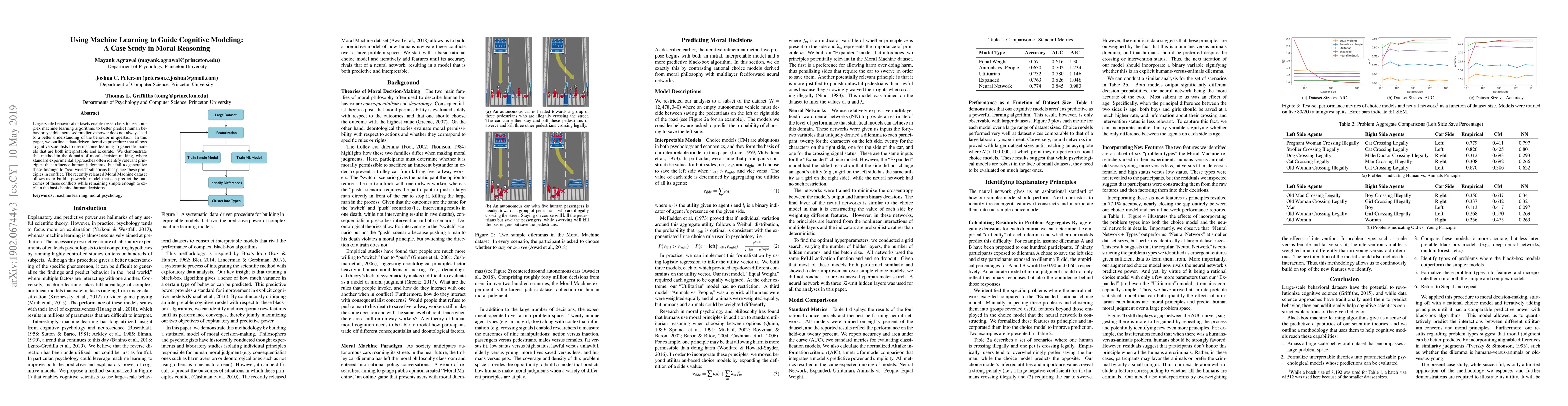 Large-scale behavioral datasets enable researchers to use complex machine learning algorithms to better predict human behavior, yet this increased predictive power does not always lead to a better understanding of the behavior in question. In this paper, we outline a data-driven, iterative procedure that allows cognitive scientists to use machine learning to generate models that are both interpretable and accurate. We demonstrate this method in the domain of moral decision-making, where standard experimental approaches often identify relevant principles that influence human judgments, but fail to generalize these findings to "real world" situations that place these principles in conflict. The recently released Moral Machine dataset allows us to build a powerful model that can predict the outcomes of these conflicts while remaining simple enough to explain the basis behind human decisions.