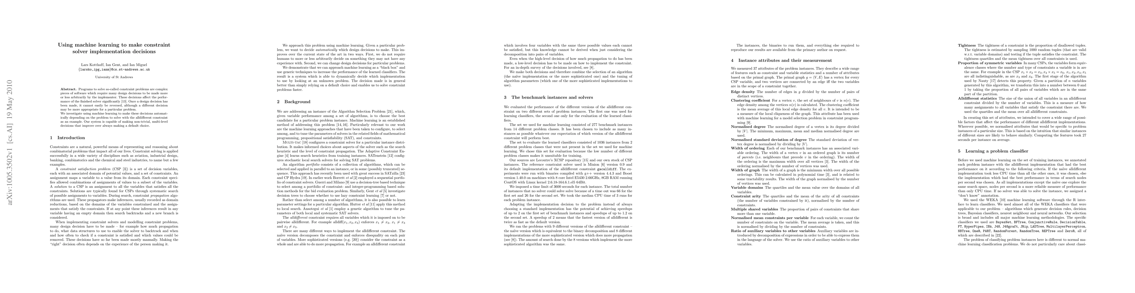 Researchers used machine learning to make decisions about constraint solver implementation, finding it can improve performance over default choices for specific problems like the alldifferent constraint.