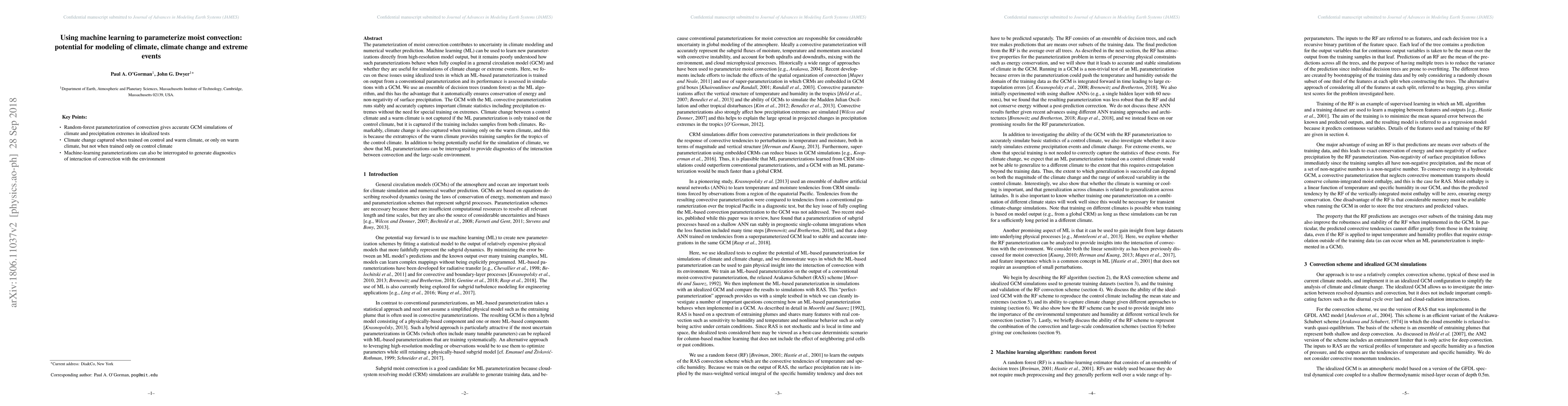 This paper explores using machine learning to parameterize moist convection in climate models, demonstrating that an ensemble of decision trees can accurately capture climate statistics and precipitation extremes. The study finds that while climate change is not fully captured when training only on control climate data, it is effectively modeled when training includes samples from both control and warm climates, highlighting the potential for machine learning in climate change and extreme event simulations.