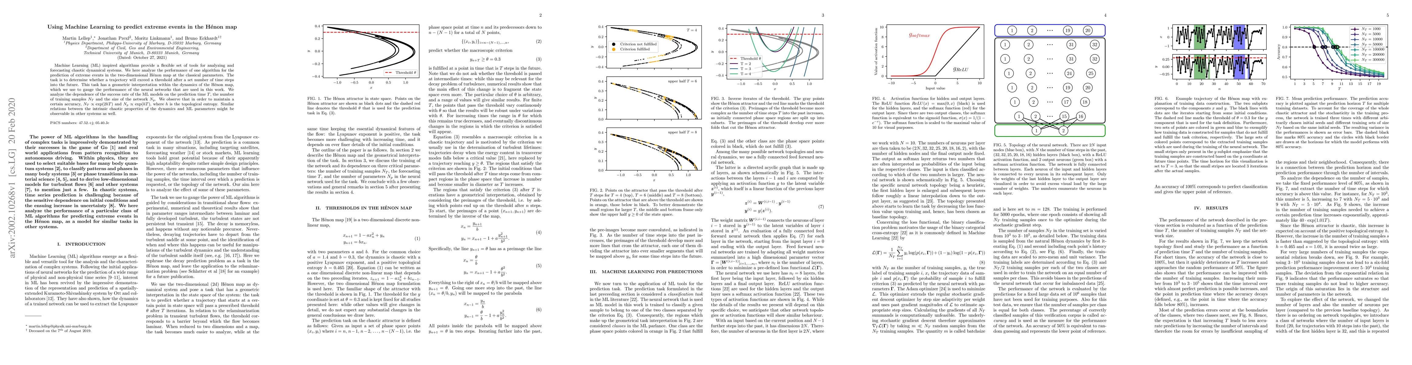 Machine Learning (ML) inspired algorithms provide a flexible set of tools for analyzing and forecasting chaotic dynamical systems. We here analyze the performance of one algorithm for the prediction of extreme events in the two-dimensional H\'enon map at the classical parameters. The task is to determine whether a trajectory will exceed a threshold after a set number of time steps into the future. This task has a geometric interpretation within the dynamics of the H\'enon map, which we use to gauge the performance of the neural networks that are used in this work. We analyze the dependence of the success rate of the ML models on the prediction time $T$ , the number of training samples $N_T$ and the size of the network $N_p$. We observe that in order to maintain a certain accuracy, $N_T \propto exp(2 h T)$ and $N_p \propto exp(hT)$, where $h$ is the topological entropy. Similar relations between the intrinsic chaotic properties of the dynamics and ML parameters might be observable in other systems as well.