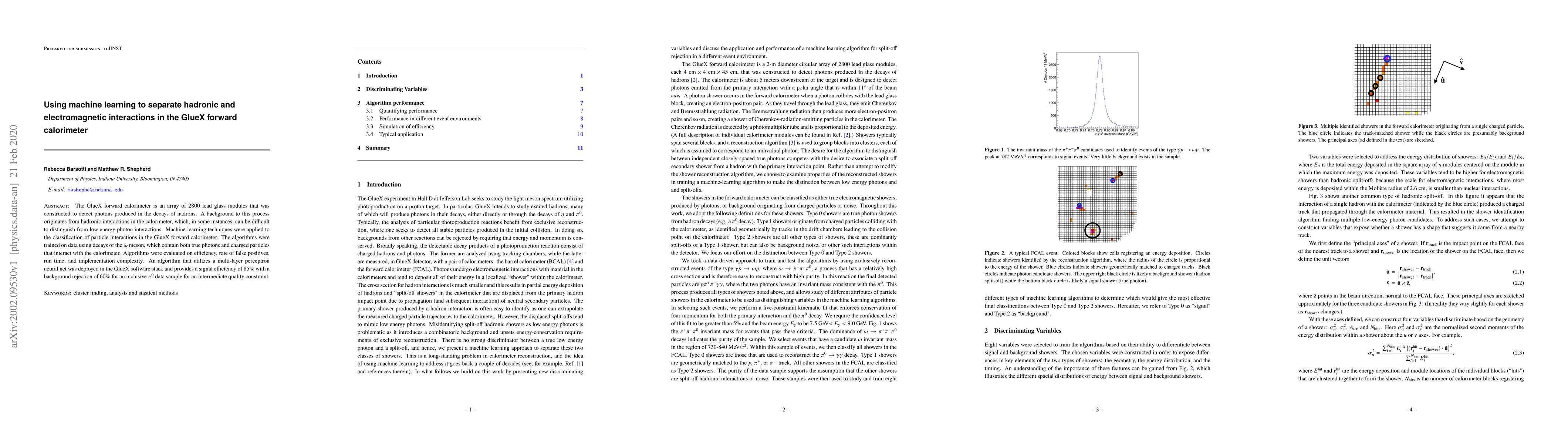 Machine learning techniques were used to separate hadronic and electromagnetic interactions in the GlueX forward calorimeter, achieving a signal efficiency of 85% with a background rejection of 60%. The algorithm's performance was evaluated for efficiency, false positives, run time, and complexity.