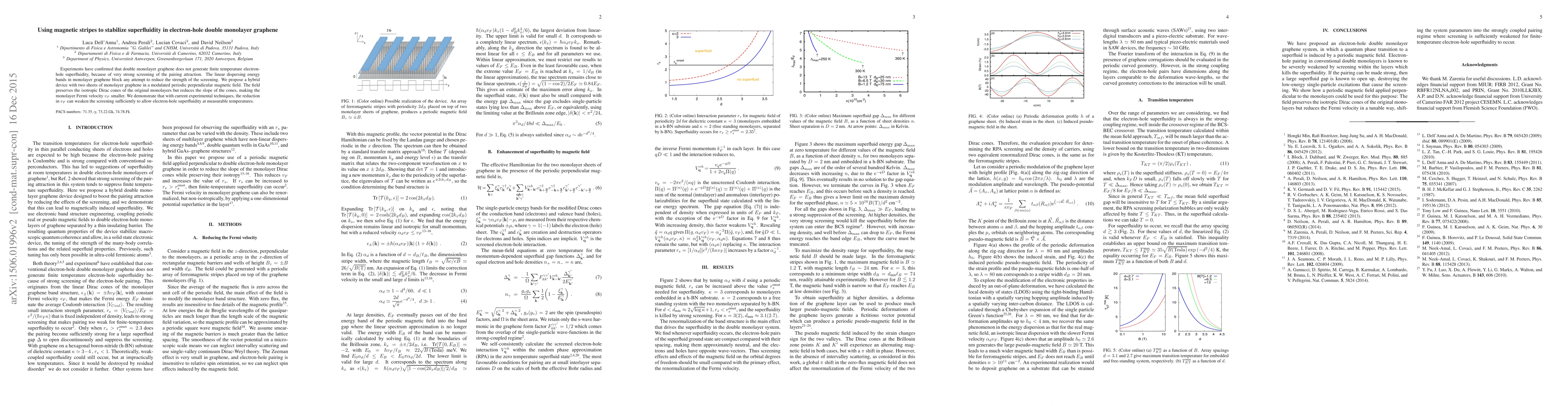 This paper proposes a novel method to stabilize superfluidity in electron-hole double monolayer graphene by applying a modulated perpendicular magnetic field. This field reduces the Fermi velocity, thereby weakening the strong screening that previously prevented superfluidity, potentially enabling it at measurable temperatures.