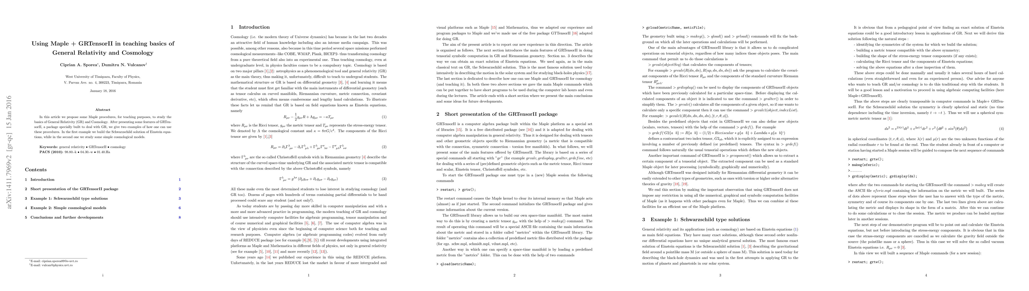 This paper introduces Maple procedures and the GRTensorII package for teaching General Relativity and Cosmology, demonstrating their application through the derivation of the Schwarzschild solution and the analysis of simple cosmological models.