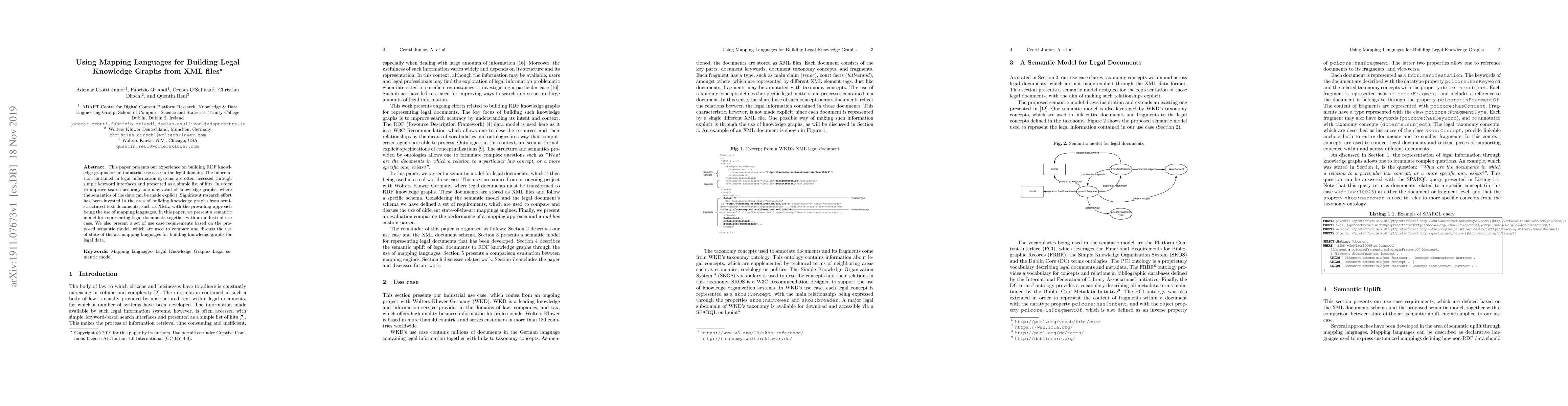This paper presents our experience on building RDF knowledge graphs for an industrial use case in the legal domain. The information contained in legal information systems are often accessed through simple keyword interfaces and presented as a simple list of hits. In order to improve search accuracy one may avail of knowledge graphs, where the semantics of the data can be made explicit. Significant research effort has been invested in the area of building knowledge graphs from semi-structured text documents, such as XML, with the prevailing approach being the use of mapping languages. In this paper, we present a semantic model for representing legal documents together with an industrial use case. We also present a set of use case requirements based on the proposed semantic model, which are used to compare and discuss the use of state-of-the-art mapping languages for building knowledge graphs for legal data.