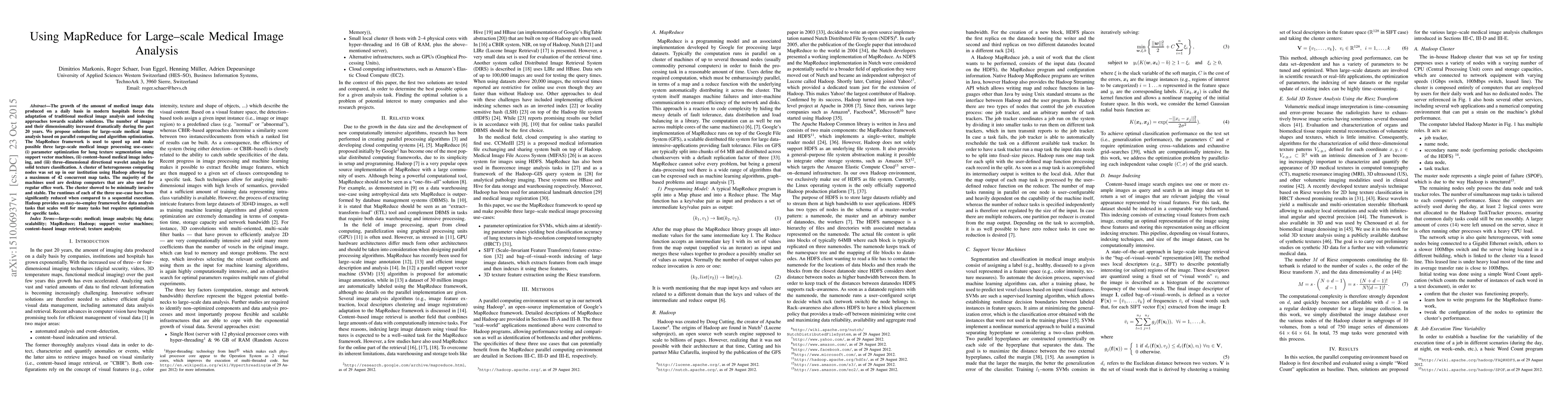 This paper explores using the MapReduce framework in a Hadoop cluster for large-scale medical image analysis, achieving significant speedups in three use-cases: lung texture segmentation, content-based indexing, and 3D wavelet analysis. The proposed parallel computing approach effectively leverages a heterogeneous cluster of mostly dual-purpose desktop computers.