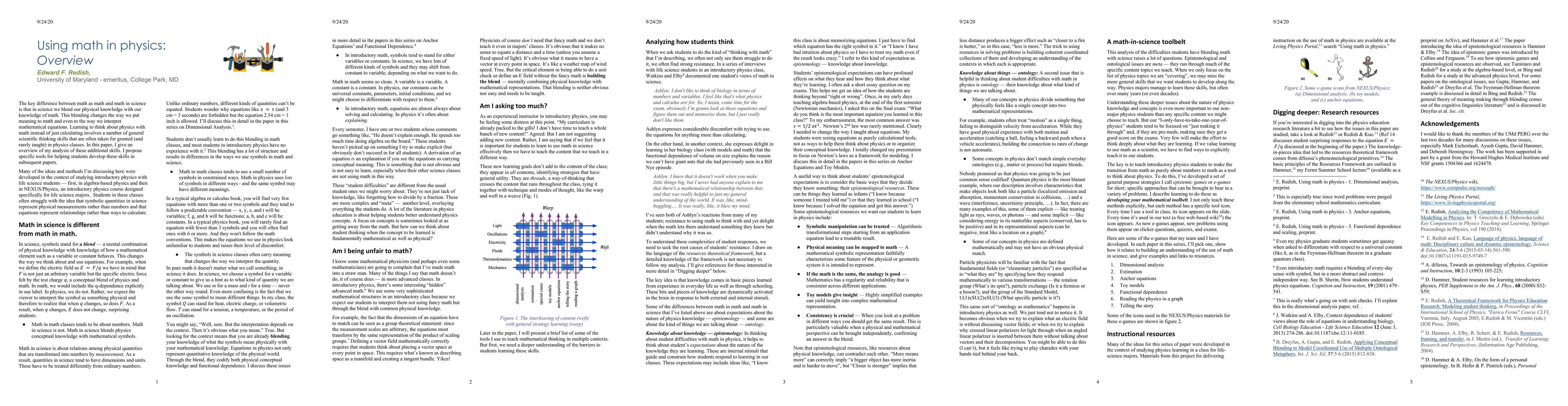 The key difference between math as math and math in science is that in science we blend our physical knowledge with our knowledge of math. This blending changes the way we put meaning to math and even to the way we interpret mathematical equations. Learning to think about physics with math instead of just calculating involves a number of general scientific thinking skills that are often taken for granted (and rarely taught) in physics classes. In this paper, I give an overview of my analysis of these additional skills. I propose specific tools for helping students develop these skills in subsequent papers.