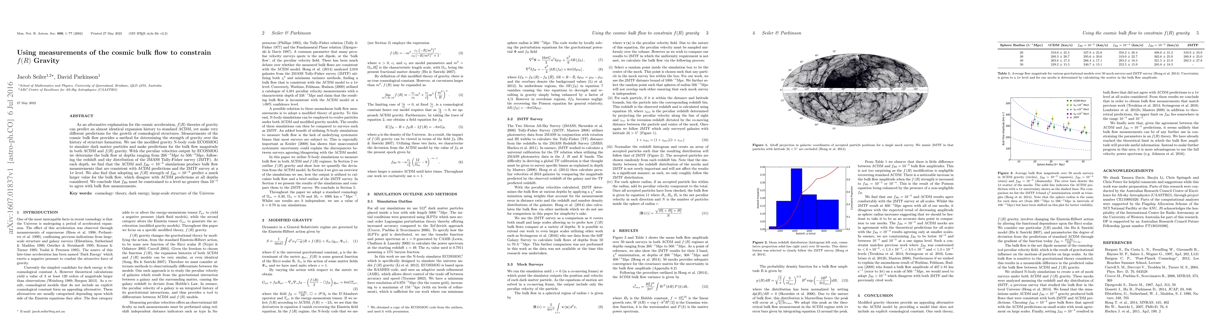 This paper explores the use of cosmic bulk flow measurements to constrain $f(R)$ gravity, finding that while $f_{R0} = 10^{-5}$ is consistent with $\Lambda$CDM predictions, $f_{R0} = 10^{-3}$ significantly diverges. The study concludes that $f_{R0}$ must be constrained to $10^{-4}$ or less to align with observed bulk flow data.