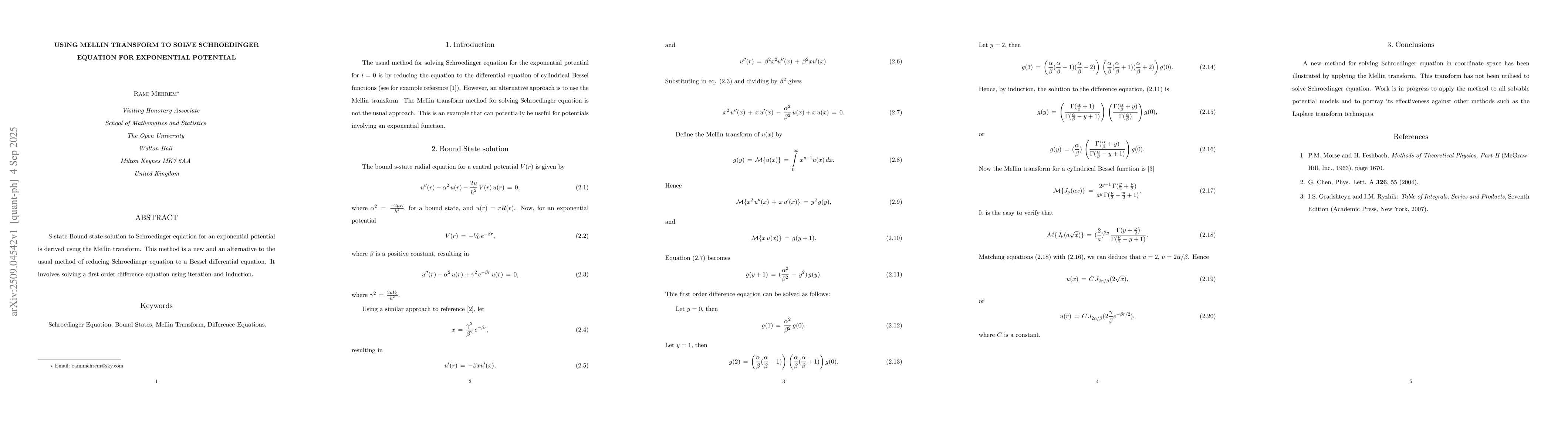 S-state Bound state solution to Schroedinger equation for an exponential potential is derived using the Mellin transform. This method is a new and an alternative to the usual method of reducing Schroedinegr equation to a Bessel differential equation. It involves solving a first order difference equation using iteration and induction.