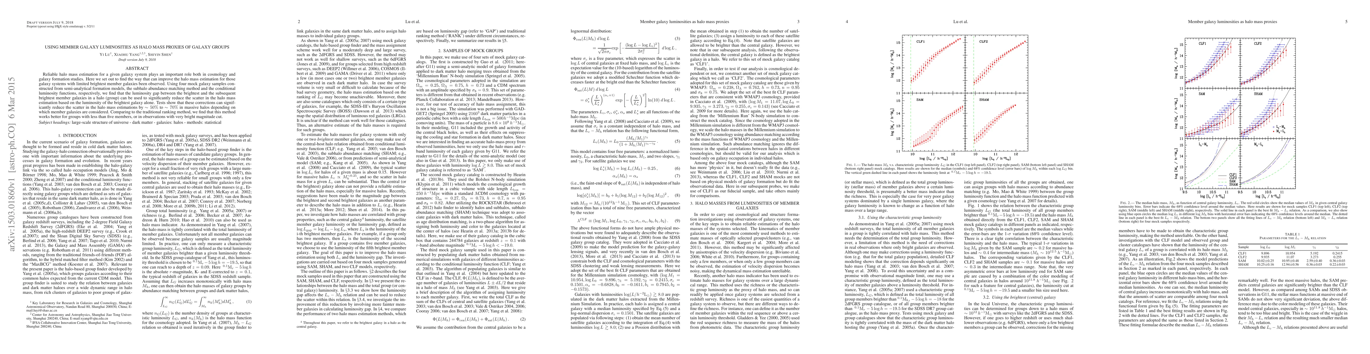 This paper proposes a method to improve halo mass estimation for galaxy groups by using the luminosity gap between the brightest and subsequent brightest member galaxies, reducing the estimation scatter by 50% to 70% in massive halos. This approach is more effective for smaller groups or observations with bright magnitude cuts compared to traditional methods.