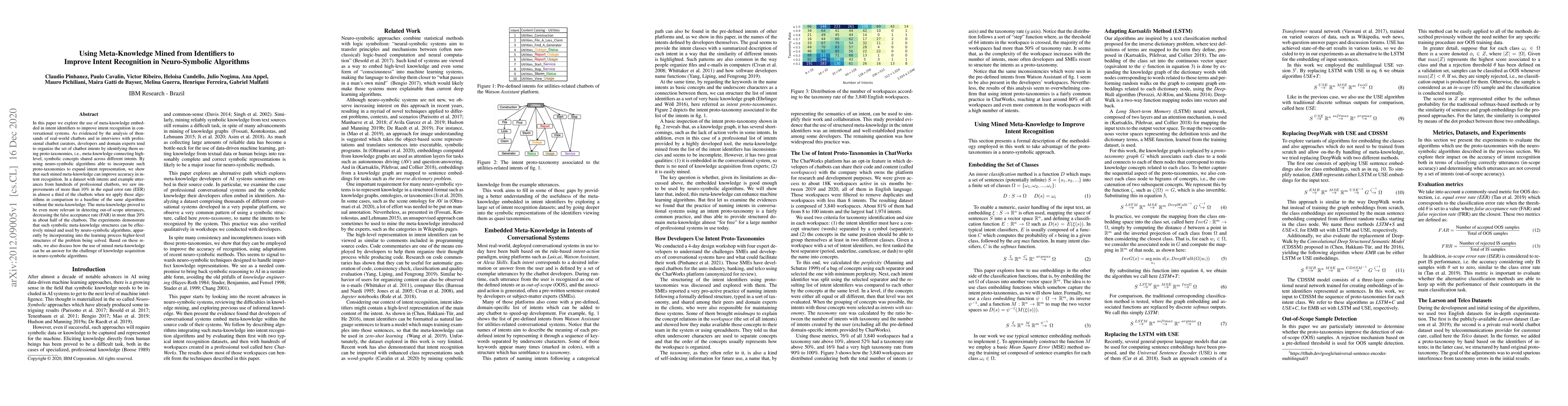 In this paper we explore the use of meta-knowledge embedded in intent identifiers to improve intent recognition in conversational systems. As evidenced by the analysis of thousands of real-world chatbots and in interviews with professional chatbot curators, developers and domain experts tend to organize the set of chatbot intents by identifying them using proto-taxonomies, i.e., meta-knowledge connecting high-level, symbolic concepts shared across different intents. By using neuro-symbolic algorithms able to incorporate such proto-taxonomies to expand intent representation, we show that such mined meta-knowledge can improve accuracy in intent recognition. In a dataset with intents and example utterances from hundreds of professional chatbots, we saw improvements of more than 10% in the equal error rate (EER) in almost a third of the chatbots when we apply those algorithms in comparison to a baseline of the same algorithms without the meta-knowledge. The meta-knowledge proved to be even more relevant in detecting out-of-scope utterances, decreasing the false acceptance rate (FAR) in more than 20\% in about half of the chatbots. The experiments demonstrate that such symbolic meta-knowledge structures can be effectively mined and used by neuro-symbolic algorithms, apparently by incorporating into the learning process higher-level structures of the problem being solved. Based on these results, we also discuss how the use of mined meta-knowledge can be an answer for the challenge of knowledge acquisition in neuro-symbolic algorithms.
