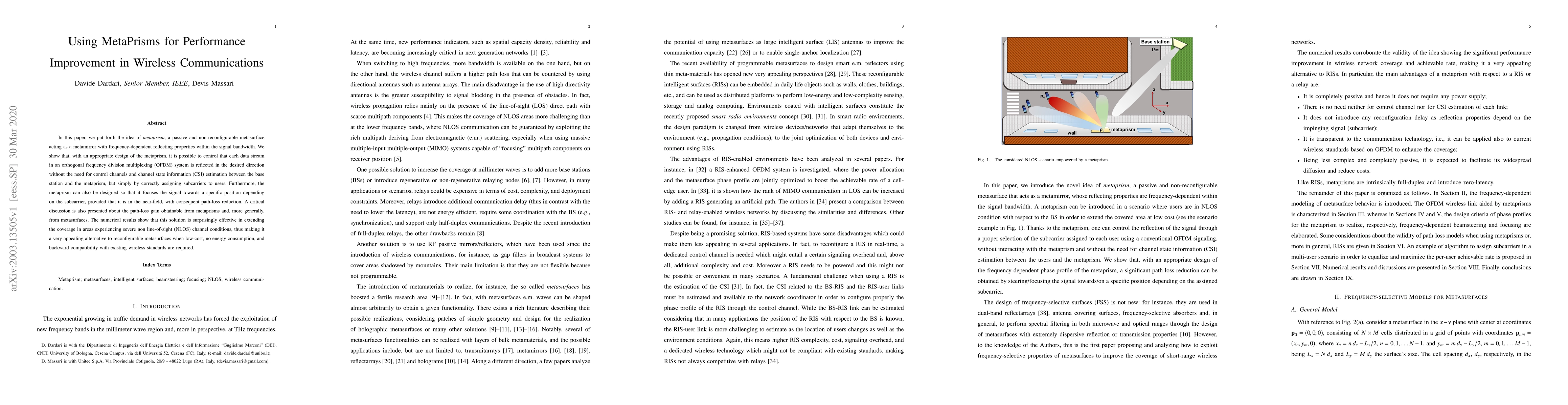In this paper, we put forth the idea of metaprism, a passive and non-reconfigurable metasurface acting as a metamirror with frequency-dependent reflecting properties within the signal bandwidth. We show that, with an appropriate design of the metaprism, it is possible to control that each data stream in an orthogonal frequency division multiplexing (OFDM) system is reflected in the desired direction without the need for control channels and channel state information (CSI) estimation between the base station and the metaprism, but simply by correctly assigning subcarriers to users. Furthermore, the metaprism can also be designed so that it focuses the signal towards a specific position depending on the subcarrier, provided that it is in the near-field, with consequent path-loss reduction. A critical discussion is also presented about the path-loss gain obtainable from metaprisms and, more generally, from metasurfaces. The numerical results show that this solution is surprisingly effective in extending the coverage in areas experiencing severe non line-of-sight (NLOS) channel conditions, thus making it a very appealing alternative to reconfigurable metasurfaces when low-cost, no energy consumption, and backward compatibility with existing wireless standards are required.