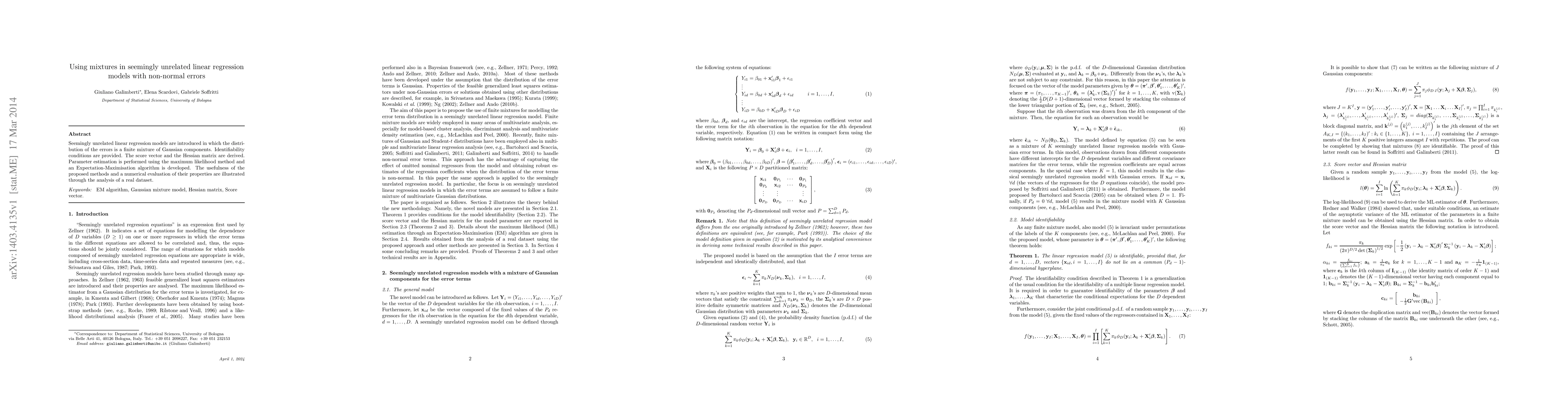 This paper presents a method for seemingly unrelated linear regression models with non-normal error distributions modeled as a finite mixture of Gaussian components. The authors derive identifiability conditions, the score vector, and the Hessian matrix, and propose a maximum likelihood estimation using an Expectation-Maximisation algorithm, demonstrating its effectiveness through a real dataset analysis.