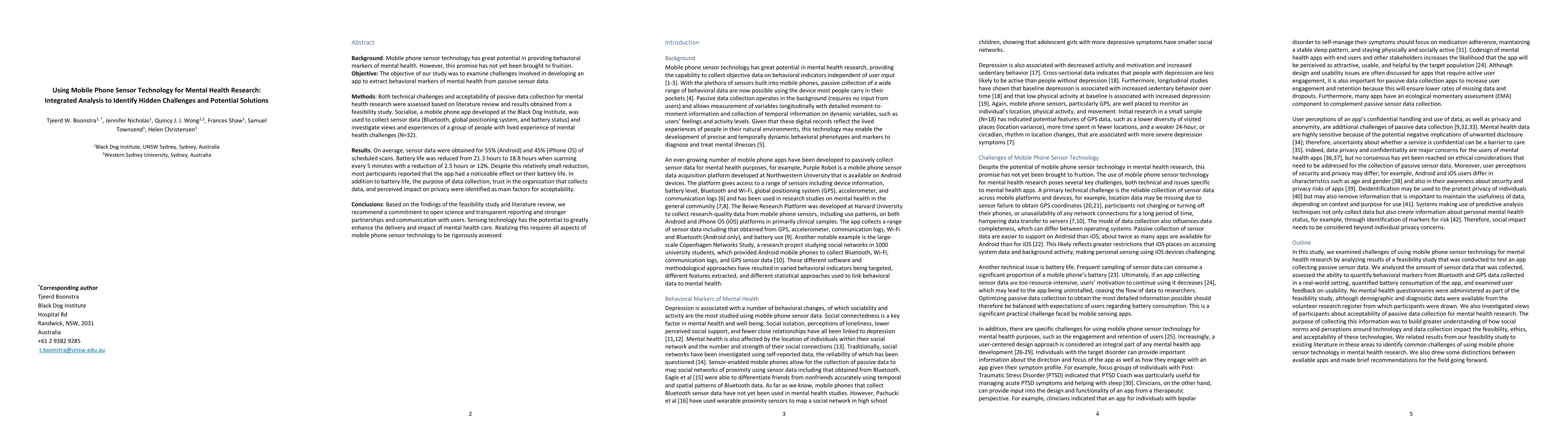 Background: Mobile phone sensor technology has great potential in providing behavioral markers of mental health. However, this promise has not yet been brought to fruition. Objective: The objective of our study was to examine challenges involved in developing an app to extract behavioral markers of mental health from passive sensor data. Methods: Both technical challenges and acceptability of passive data collection for mental health research were assessed based on literature review and results obtained from a feasibility study. Socialise, a mobile phone app developed at the Black Dog Institute, was used to collect sensor data (Bluetooth, global positioning system, and battery status) and investigate views and experiences of a group of people with lived experience of mental health challenges (N=32). Results: On average, sensor data were obtained for 55% (Android) and 45% (iPhone OS) of scheduled scans. Battery life was reduced from 21.3 hours to 18.8 hours when scanning every 5 minutes with a reduction of 2.5 hours or 12%. Despite this relatively small reduction, most participants reported that the app had a noticeable effect on their battery life. In addition to battery life, the purpose of data collection, trust in the organization that collects data, and perceived impact on privacy were identified as main factors for acceptability. Conclusions: Based on the findings of the feasibility study and literature review, we recommend a commitment to open science and transparent reporting and stronger partnerships and communication with users. Sensing technology has the potential to greatly enhance the delivery and impact of mental health care. Realizing this requires all aspects of mobile phone sensor technology to be rigorously assessed.