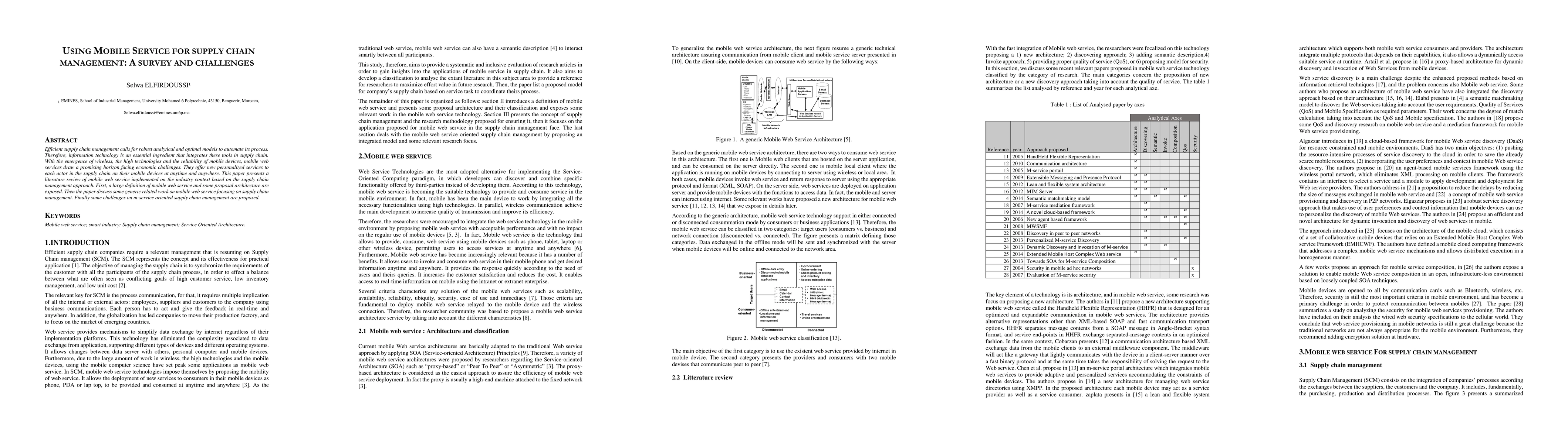 Efficient supply chain management calls for robust analytical and optimal models to automate its process. Therefore, information technology is an essential ingredient that integrates these tools in supply chain. With the emergence of wireless, the high technologies and the reliability of mobile devices, mobile web services draw a promising horizon facing economic challenges. They offer new personalized services to each actor in the supply chain on their mobile devices at anytime and anywhere. This paper presents a literature review of mobile web service implemented on the industry context based on the supply chain management approach. First, a large definition of mobile web service and some proposal architecture are exposed. Then the paper discuss some generic related work on mobile web service focusing on supply chain management. Finally some challenges on m-service oriented supply chain management are proposed.