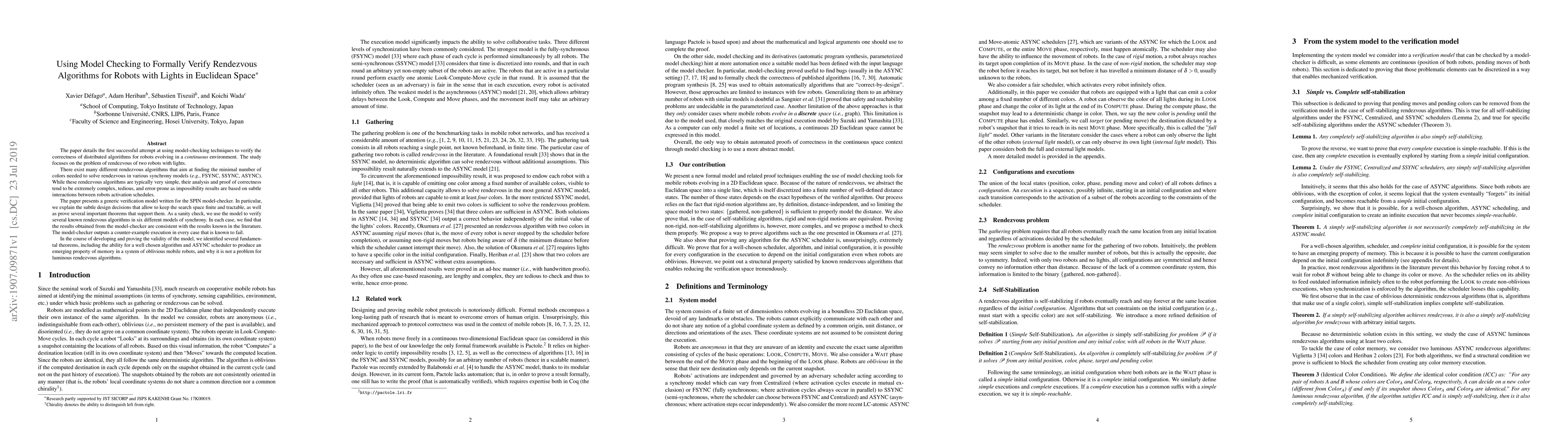This paper employs model-checking techniques to formally verify the correctness of distributed rendezvous algorithms for robots with lights in a continuous environment. The authors develop a verification model for the SPIN model-checker, proving several theorems that support its design, and successfully verify known algorithms in various synchrony models, confirming existing literature results.