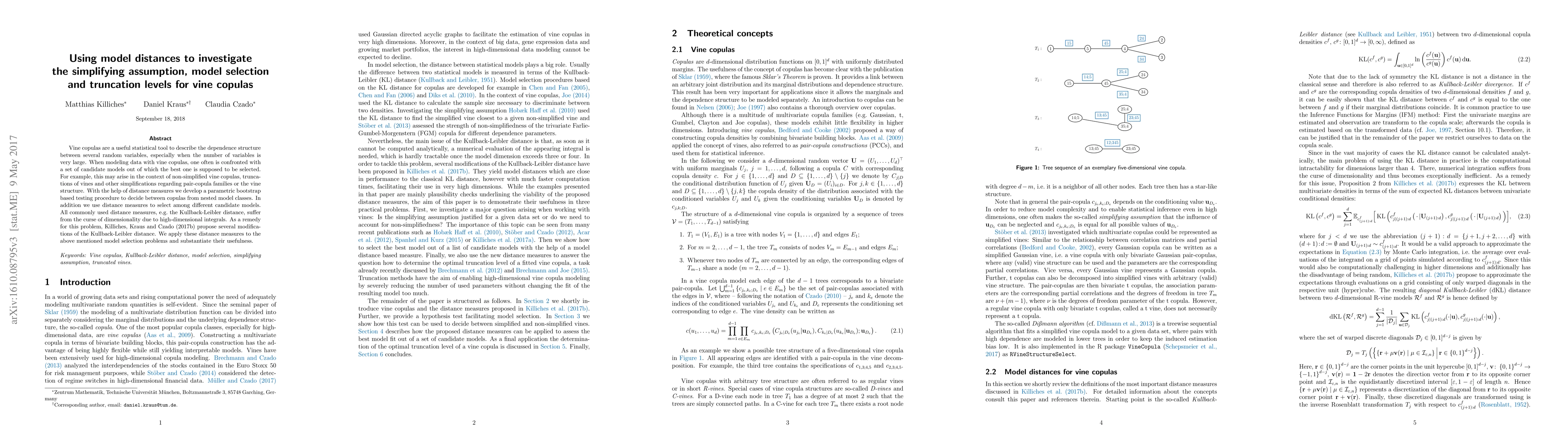 This paper develops a parametric bootstrap testing procedure using model distances to select the best vine copula model from nested classes and to address simplifications like truncation levels. It applies modified Kullback-Leibler distances to overcome the curse of dimensionality, demonstrating their effectiveness in model selection.