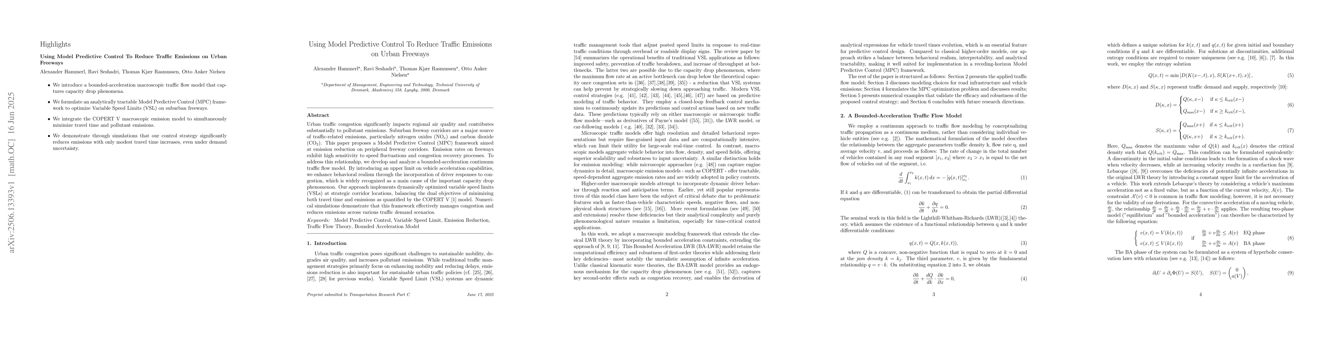 Urban traffic congestion significantly impacts regional air quality and contributes substantially to pollutant emissions. Suburban freeway corridors are a major source of traffic-related emissions, particularly nitrogen oxides (NOx) and carbon dioxide (CO2). This paper proposes a Model Predictive Control (MPC) framework aimed at emission reduction on peripheral freeway corridors. Emission rates on freeways exhibit high sensitivity to speed fluctuations and congestion recovery processes. To address this relationship, we develop and analyze a bounded-acceleration continuum traffic flow model. By introducing an upper limit on vehicle acceleration capabilities, we enhance behavioral realism through the incorporation of driver responses to congestion, which is widely recognized as a main cause of the important capacity drop phenomenon. Our approach implements dynamically optimized variable speed limits (VSLs) at strategic corridor locations, balancing the dual objectives of minimizing both travel time and emissions as quantified by the COPERT V [1] model. Numerical simulations demonstrate that this framework effectively manages congestion and reduces emissions across various traffic demand scenarios.