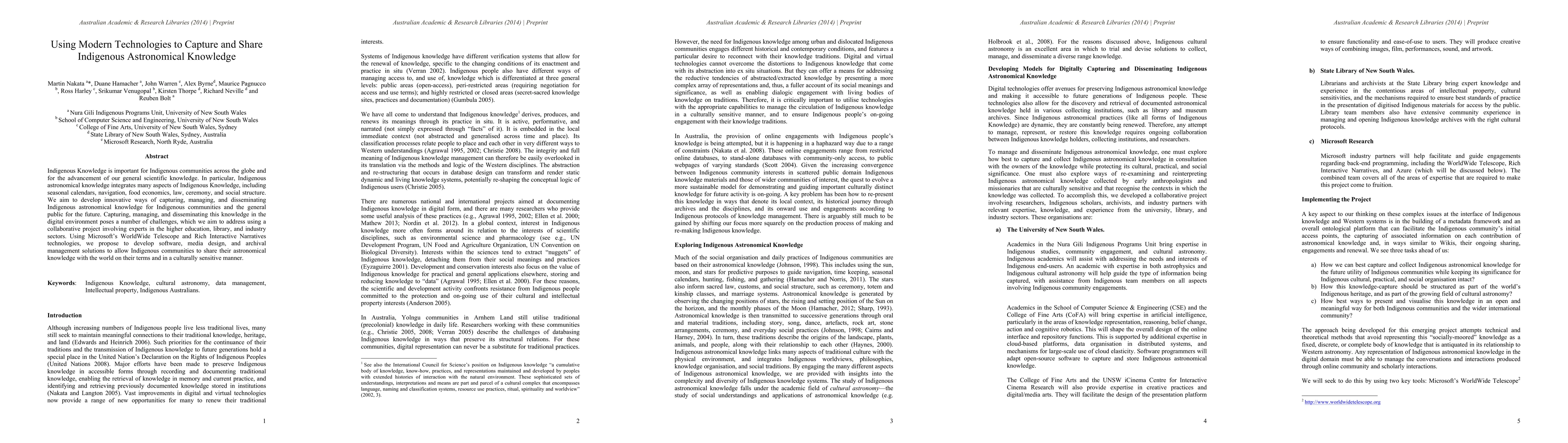 Indigenous Knowledge is important for Indigenous communities across the globe and for the advancement of our general scientific knowledge. In particular, Indigenous astronomical knowledge integrates many aspects of Indigenous Knowledge, including seasonal calendars, navigation, food economics, law, ceremony, and social structure. We aim to develop innovative ways of capturing, managing, and disseminating Indigenous astronomical knowledge for Indigenous communities and the general public for the future. Capturing, managing, and disseminating this knowledge in the digital environment poses a number of challenges, which we aim to address using a collaborative project involving experts in the higher education, library, and industry sectors. Using Microsoft's WorldWide Telescope and Rich Interactive Narratives technologies, we propose to develop software, media design, and archival management solutions to allow Indigenous communities to share their astronomical knowledge with the world on their terms and in a culturally sensitive manner.