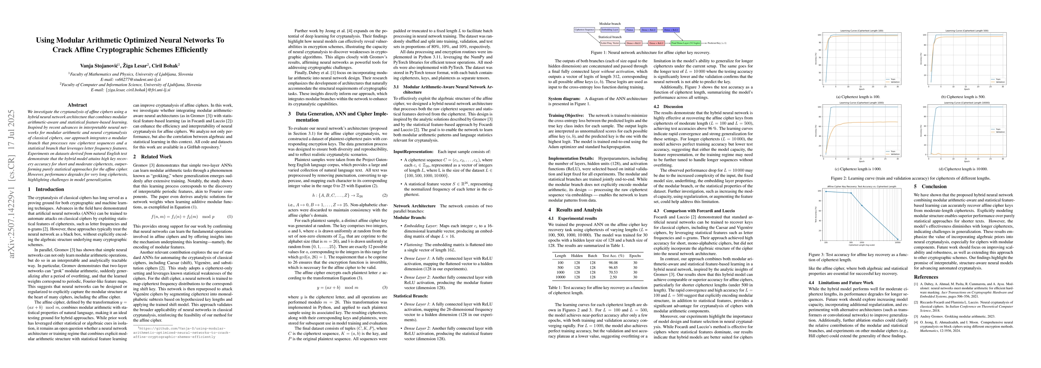 The paper presents a novel hybrid neural network architecture that combines modular arithmetic-aware and statistical feature-based learning for efficient cryptanalysis of affine ciphers.