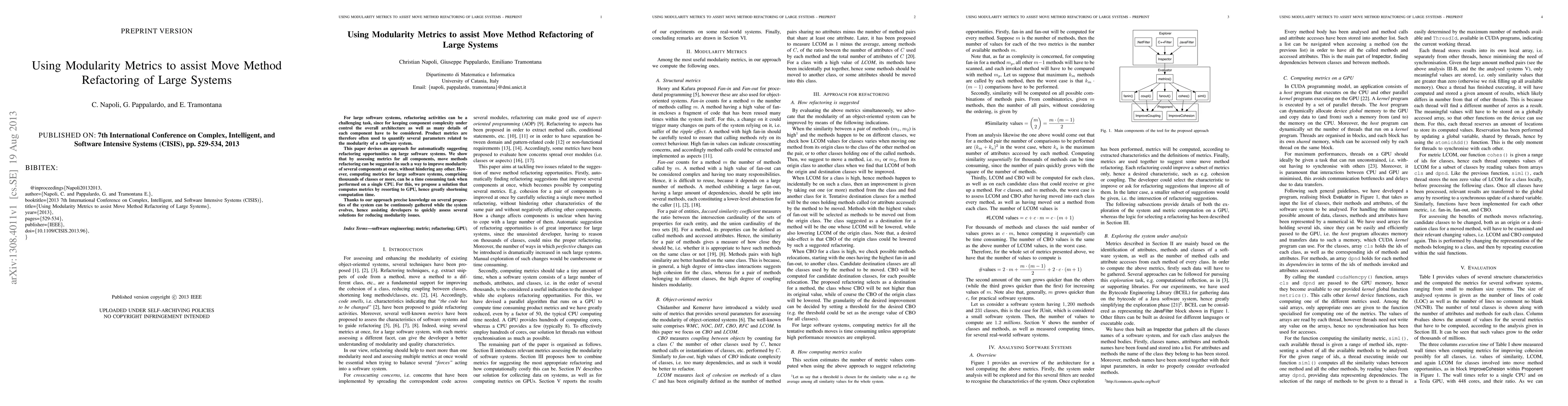 For large software systems, refactoring activities can be a challenging task, since for keeping component complexity under control the overall architecture as well as many details of each component have to be considered. Product metrics are therefore often used to quantify several parameters related to the modularity of a software system. This paper devises an approach for automatically suggesting refactoring opportunities on large software systems. We show that by assessing metrics for all components, move methods refactoring an be suggested in such a way to improve modularity of several components at once, without hindering any other. However, computing metrics for large software systems, comprising thousands of classes or more, can be a time consuming task when performed on a single CPU. For this, we propose a solution that computes metrics by resorting to GPU, hence greatly shortening computation time. Thanks to our approach precise knowledge on several properties of the system can be continuously gathered while the system evolves, hence assisting developers to quickly assess several solutions for reducing modularity issues.