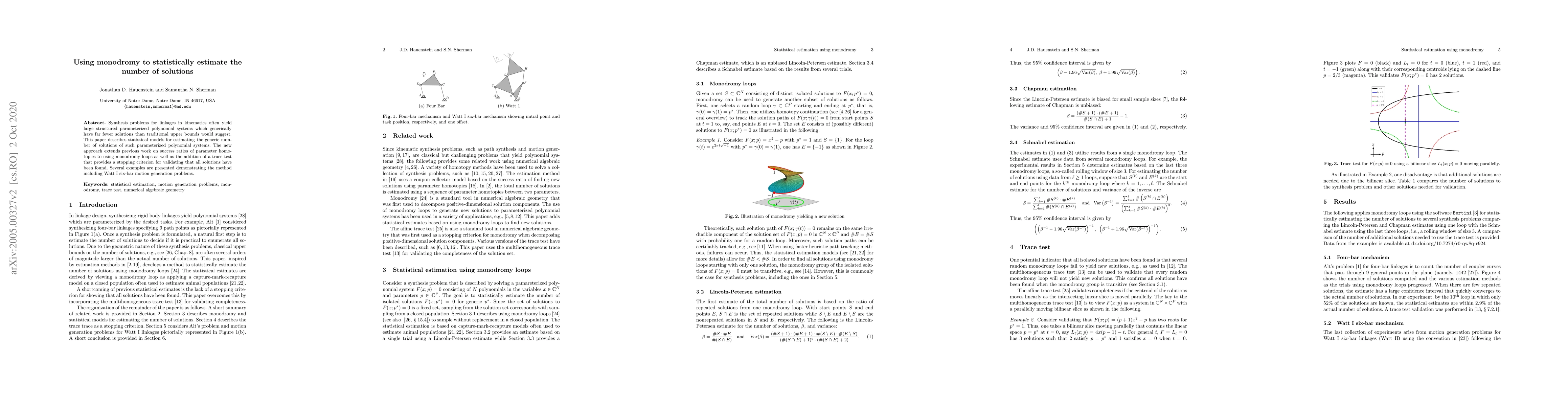 Synthesis problems for linkages in kinematics often yield large structured parameterized polynomial systems which generically have far fewer solutions than traditional upper bounds would suggest. This paper describes statistical models for estimating the generic number of solutions of such parameterized polynomial systems. The new approach extends previous work on success ratios of parameter homotopies to using monodromy loops as well as the addition of a trace test that provides a stopping criterion for validating that all solutions have been found. Several examples are presented demonstrating the method including Watt I six-bar motion generation problems.