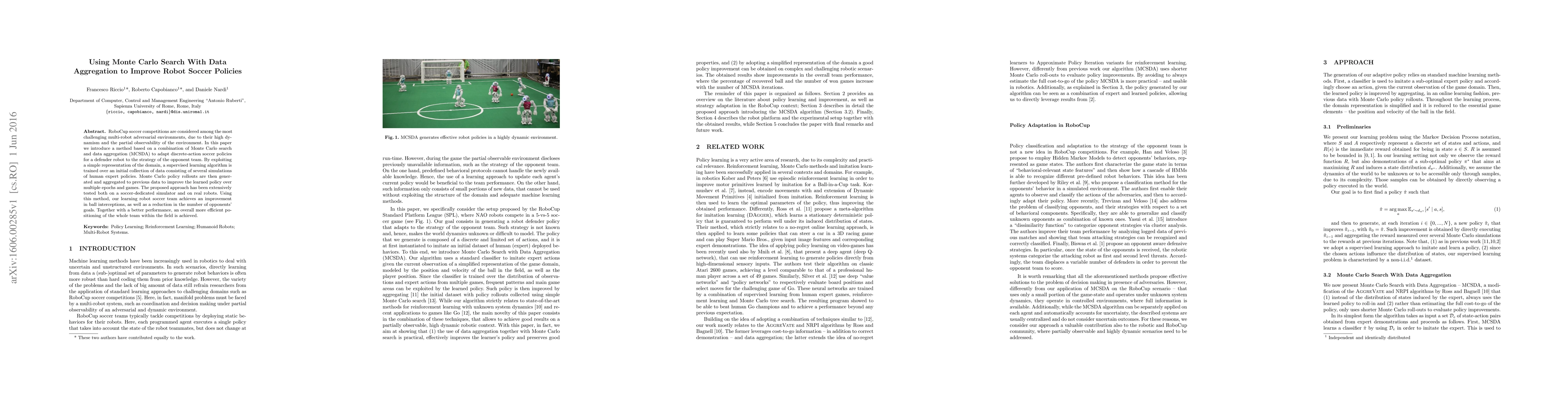 RoboCup soccer competitions are considered among the most challenging multi-robot adversarial environments, due to their high dynamism and the partial observability of the environment. In this paper we introduce a method based on a combination of Monte Carlo search and data aggregation (MCSDA) to adapt discrete-action soccer policies for a defender robot to the strategy of the opponent team. By exploiting a simple representation of the domain, a supervised learning algorithm is trained over an initial collection of data consisting of several simulations of human expert policies. Monte Carlo policy rollouts are then generated and aggregated to previous data to improve the learned policy over multiple epochs and games. The proposed approach has been extensively tested both on a soccer-dedicated simulator and on real robots. Using this method, our learning robot soccer team achieves an improvement in ball interceptions, as well as a reduction in the number of opponents' goals. Together with a better performance, an overall more efficient positioning of the whole team within the field is achieved.