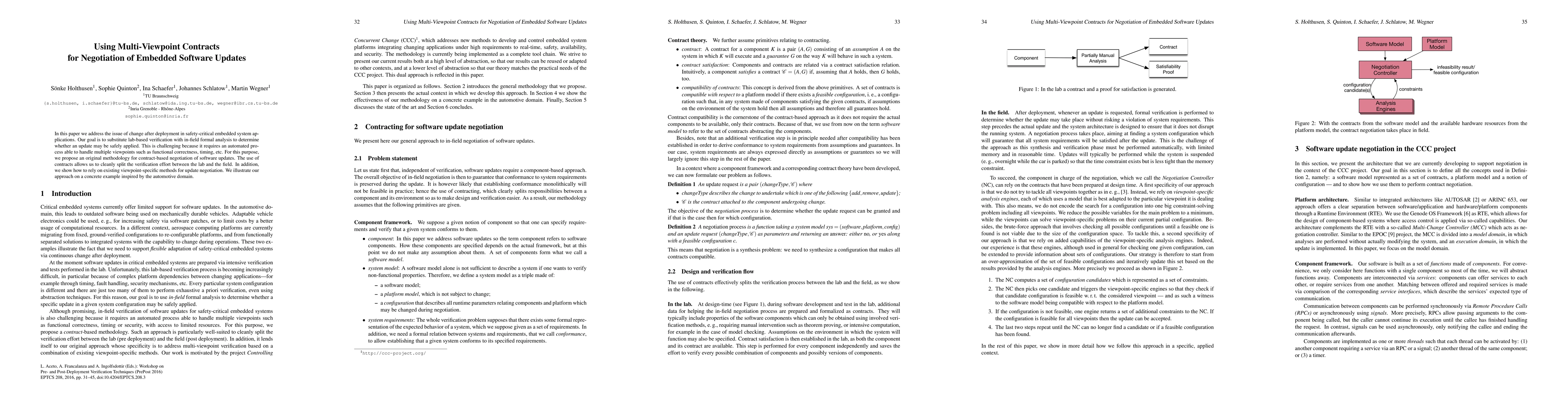 This paper proposes a contract-based methodology for negotiating updates to safety-critical embedded systems, aiming to replace lab-based verification with in-field formal analysis. The approach leverages multi-viewpoint contracts to handle various aspects like functional correctness and timing, enabling a split verification effort between lab and field.