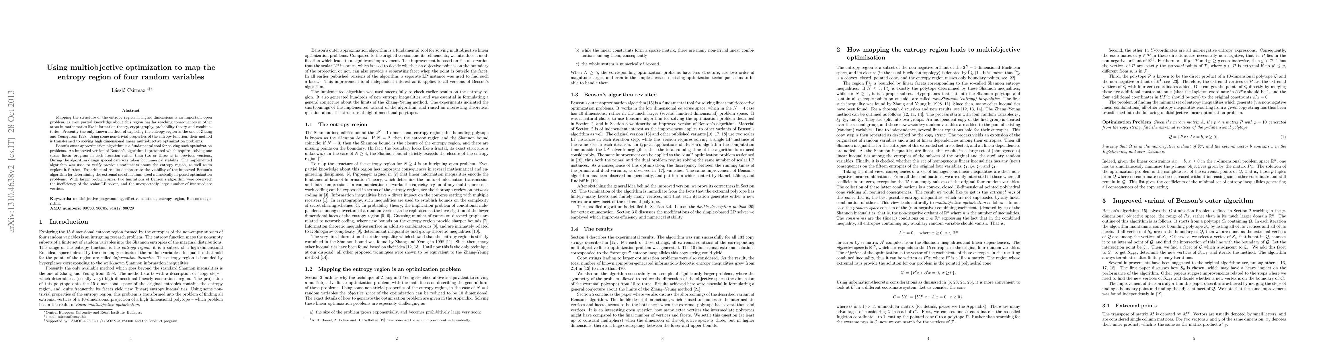 Presently the only available method of exploring the 15-dimensional entropy region formed by the entropies of four random variables is the one of Zhang and Yeung from 1998. It is argued that their method is equivalent to solving linear multiobjective optimization problems. Benson's outer approximation algorithm is a fundamental tool for solving these optimization problems. An improved version of Benson's algorithm is described which requires solving one scalar linear program in each iteration rather than two or three as in previous versions. During the algorithm design special care was taken for numerical stability. The implemented algorithm was used to check previous statements about the entropy region, and to gain new information on that region. The experimental results demonstrate the viability of the method for determining the extremal set of medium size, numerically ill-posed optimization problems. With growing problem size two limitations of Benson's algorithm have been observed: the inefficiency of the scalar LP solver on one hand and the unexpectedly large number of intermediate vertices on the other.