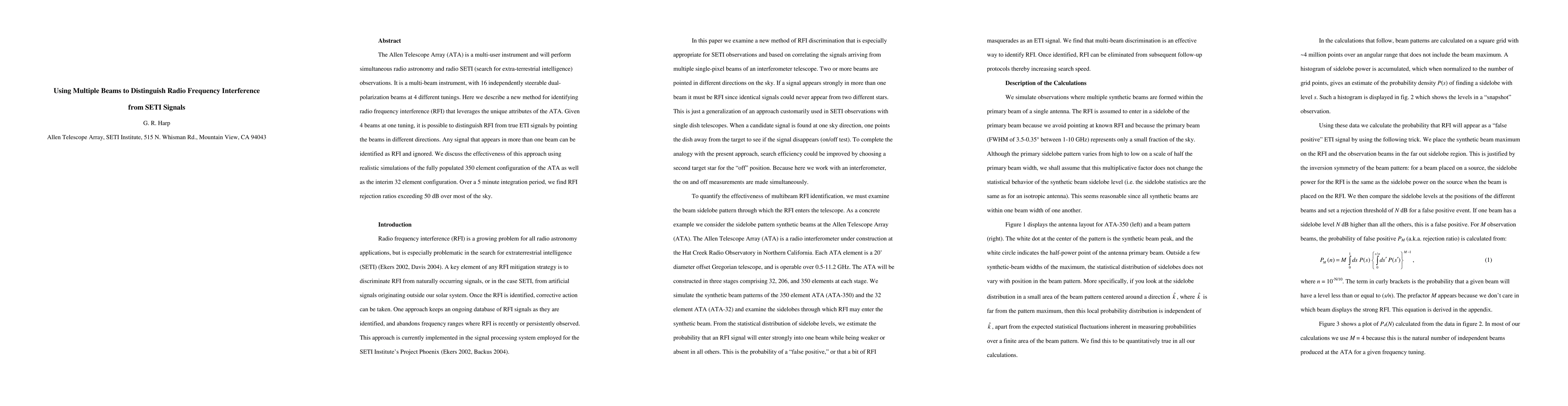 The Allen Telescope Array is a multi-user instrument and will perform simultaneous radio astronomy and radio SETI (search for extra-terrestrial intelligence) observations. It is a multi-beam instrument, with 16 independently steerable dual-polarization beams at 4 different tunings. Given 4 beams at one tuning, it is possible to distinguish RFI from true ETI signals by pointing the beams in different directions. Any signal that appears in more than one beam can be identified as RFI and ignored during SETI. We discuss the effectiveness of this approach for RFI rejection using realistic simulations of the fully populated 350 element configuration of the ATA as well as the interim 32 element configuration. Over a 5 minute integration period, we find RFI rejection ratios exceeding 50 dB over most of the sky.