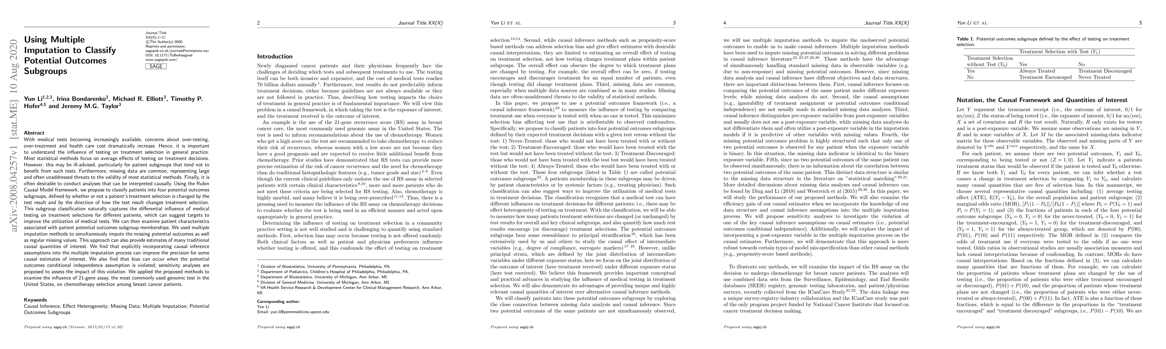 With medical tests becoming increasingly available, concerns about over-testing and over-treatment dramatically increase. Hence, it is important to understand the influence of testing on treatment selection in general practice. Most statistical methods focus on average effects of testing on treatment decisions. However, this may be ill-advised, particularly for patient subgroups that tend not to benefit from such tests. Furthermore, missing data are common, representing large and often unaddressed threats to the validity of statistical methods. Finally, it is desirable to conduct analyses that can be interpreted causally. We propose to classify patients into four potential outcomes subgroups, defined by whether or not a patient's treatment selection is changed by the test result and by the direction of how the test result changes treatment selection. This subgroup classification naturally captures the differential influence of medical testing on treatment selections for different patients, which can suggest targets to improve the utilization of medical tests. We can then examine patient characteristics associated with patient potential outcomes subgroup memberships. We used multiple imputation methods to simultaneously impute the missing potential outcomes as well as regular missing values. This approach can also provide estimates of many traditional causal quantities. We find that explicitly incorporating causal inference assumptions into the multiple imputation process can improve the precision for some causal estimates of interest. We also find that bias can occur when the potential outcomes conditional independence assumption is violated; sensitivity analyses are proposed to assess the impact of this violation. We applied the proposed methods to examine the influence of 21-gene assay, the most commonly used genomic test, on chemotherapy selection among breast cancer patients.