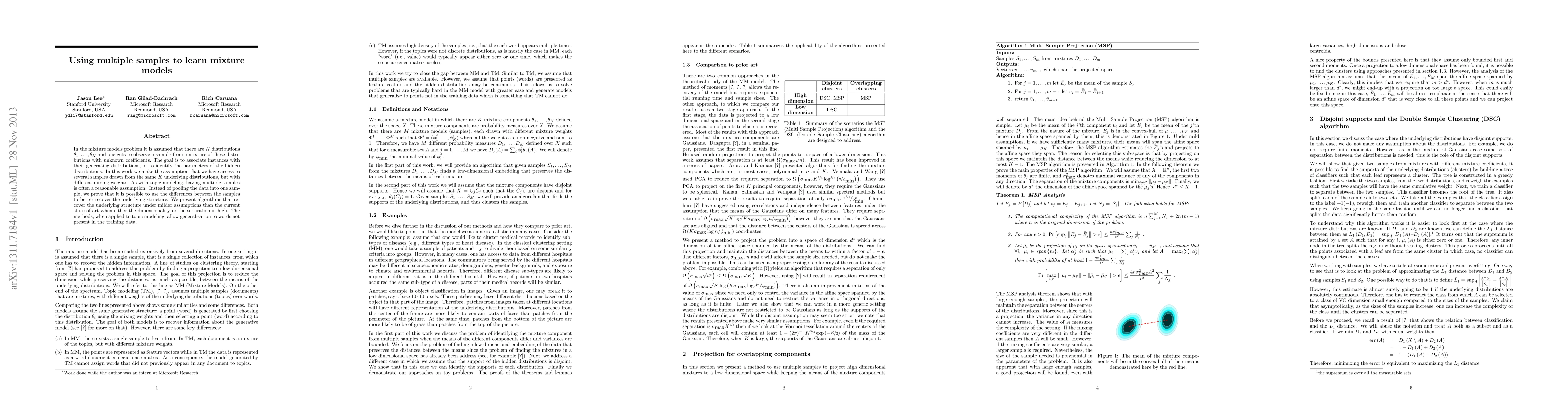 In the mixture models problem it is assumed that there are $K$ distributions $\theta_{1},\ldots,\theta_{K}$ and one gets to observe a sample from a mixture of these distributions with unknown coefficients. The goal is to associate instances with their generating distributions, or to identify the parameters of the hidden distributions. In this work we make the assumption that we have access to several samples drawn from the same $K$ underlying distributions, but with different mixing weights. As with topic modeling, having multiple samples is often a reasonable assumption. Instead of pooling the data into one sample, we prove that it is possible to use the differences between the samples to better recover the underlying structure. We present algorithms that recover the underlying structure under milder assumptions than the current state of art when either the dimensionality or the separation is high. The methods, when applied to topic modeling, allow generalization to words not present in the training data.