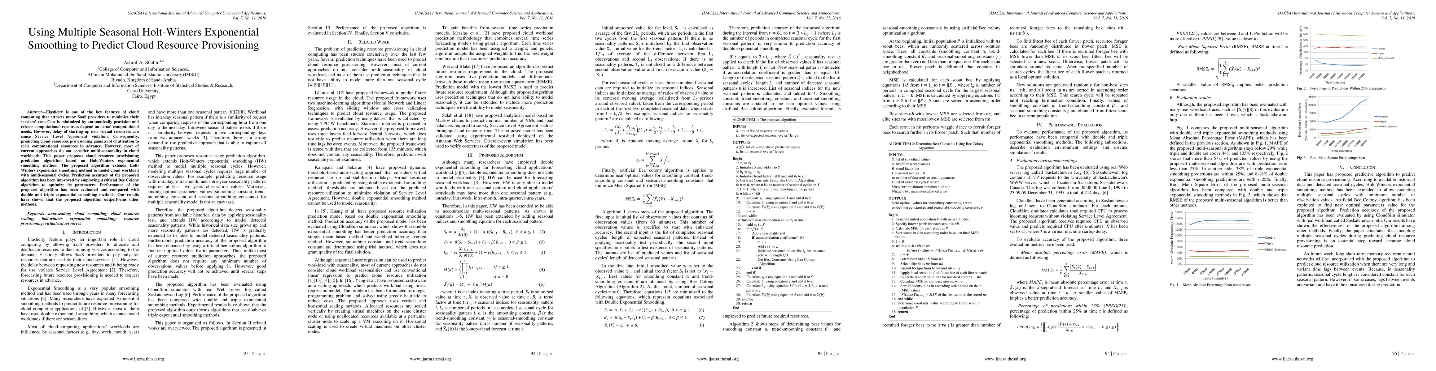 This paper proposes a cloud resource provisioning prediction algorithm using a modified Holt-Winters exponential smoothing method to account for multi-seasonal cycles in cloud workloads. The algorithm's parameters are optimized using the Artificial Bee Colony algorithm, demonstrating superior prediction accuracy compared to double and triple exponential smoothing methods.