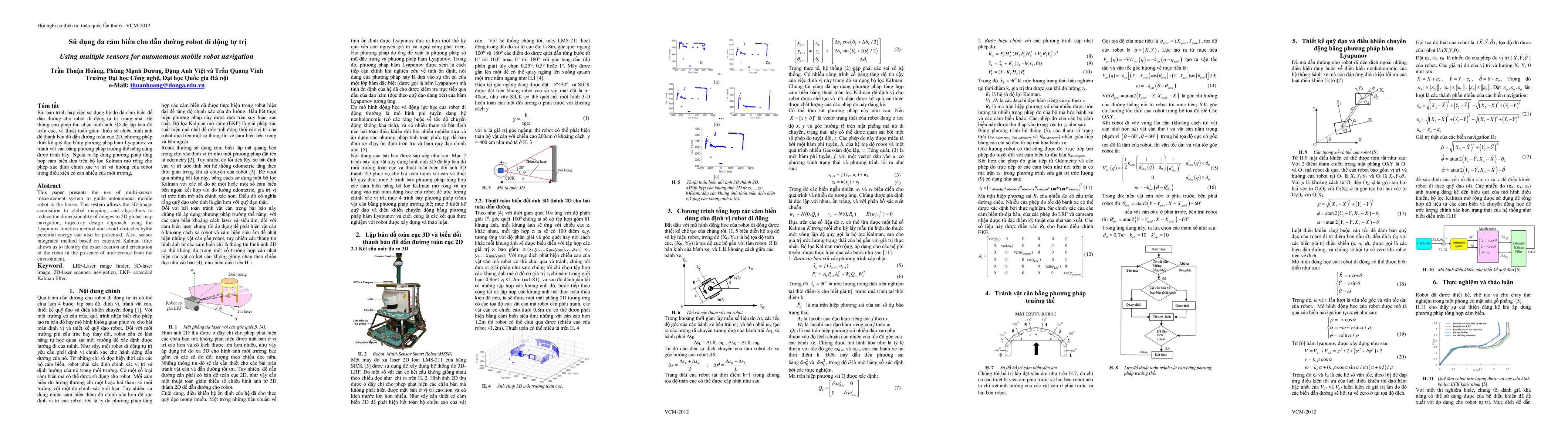 This paper presents the use of multi-sensor measurement system to guide autonomous mobile robot in the house. The system allows the 3D image acquisition to global mapping, and algorithms to reduce the dimensionality of images to 2D global map navigation, trajectory design approach using the Lyapunov function method and avoid obstacles by the potential energy can also be presented. Also, sensor integrated method based on extended Kalman filter allows us to identify the exact location and orientation of the robot in the presence of interference from the environment.