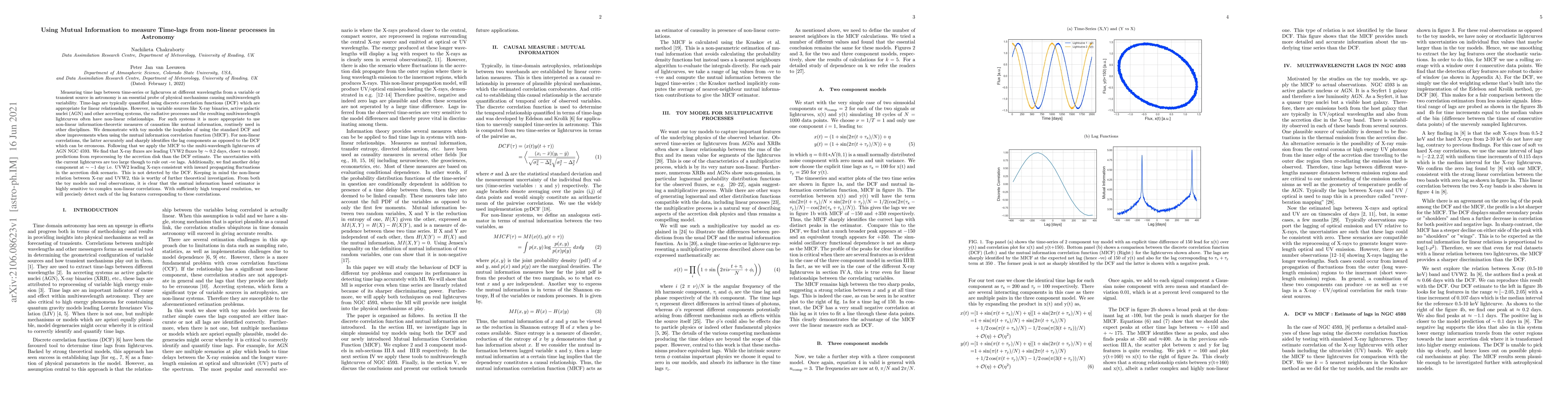 Measuring time lags between time-series or lighcurves at different wavelengths from a variable or transient source in astronomy is an essential probe of physical mechanisms causing multiwavelength variability. Time-lags are typically quantified using discrete correlation functions (DCF) which are appropriate for linear relationships. However, in variable sources like X-ray binaries, active galactic nuclei (AGN) and other accreting systems, the radiative processes and the resulting multiwavelength lightcurves often have non-linear relationships. For such systems it is more appropriate to use non-linear information-theoretic measures of causation like mutual information, routinely used in other disciplines. We demonstrate with toy models loopholes of using the standard DCF & show improvements when using the mutual information correlation function (MICF). For non-linear correlations, the latter accurately & sharply identifies the lag components as opposed to the DCF which can be erroneous. Following that we apply the MICF to the multiwavelength lightcurves of AGN NGC 4593. We find that X-ray fluxes lead UVW2 fluxes by ~0.2 days, closer to model predictions from reprocessing by the accretion disk than the DCF estimate. The uncertainties with the current lightcurves are too large though to rule out -ve lags. Additionally, we find another delay component at ~-1 day i.e. UVW2 leading X-rays consistent with inward propagating fluctuations in the accretion disk scenario. This is not detected by the DCF. Keeping in mind the non-linear relation between X-ray & UVW2, this is worthy of further theoretical investigation. From both toy models & real observations, it is clear that the mutual information based estimator is highly sensitive to complex non-linear correlations. With sufficiently high temporal resolution, we will precisely detect each of the lag features corresponding to these correlations.