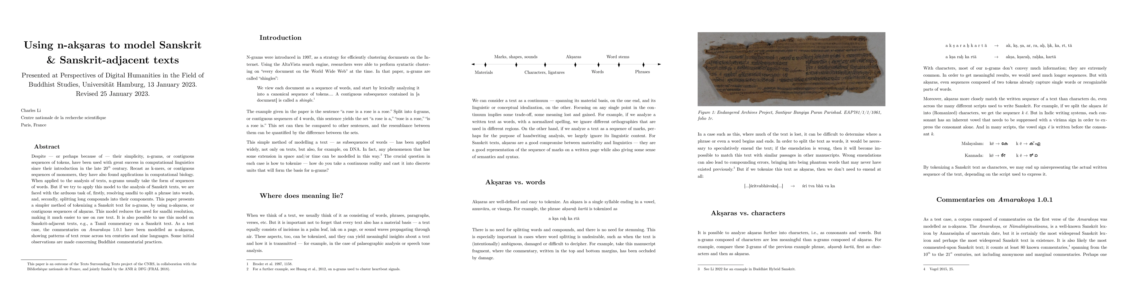Despite -- or perhaps because of -- their simplicity, n-grams, or contiguous sequences of tokens, have been used with great success in computational linguistics since their introduction in the late 20th century. Recast as k-mers, or contiguous sequences of monomers, they have also found applications in computational biology. When applied to the analysis of texts, n-grams usually take the form of sequences of words. But if we try to apply this model to the analysis of Sanskrit texts, we are faced with the arduous task of, firstly, resolving sandhi to split a phrase into words, and, secondly, splitting long compounds into their components. This paper presents a simpler method of tokenizing a Sanskrit text for n-grams, by using n-aksaras, or contiguous sequences of aksaras. This model reduces the need for sandhi resolution, making it much easier to use on raw text. It is also possible to use this model on Sanskrit-adjacent texts, e.g., a Tamil commentary on a Sanskrit text. As a test case, the commentaries on Amarakosa 1.0.1 have been modelled as n-aksaras, showing patterns of text reuse across ten centuries and nine languages. Some initial observations are made concerning Buddhist commentarial practices.