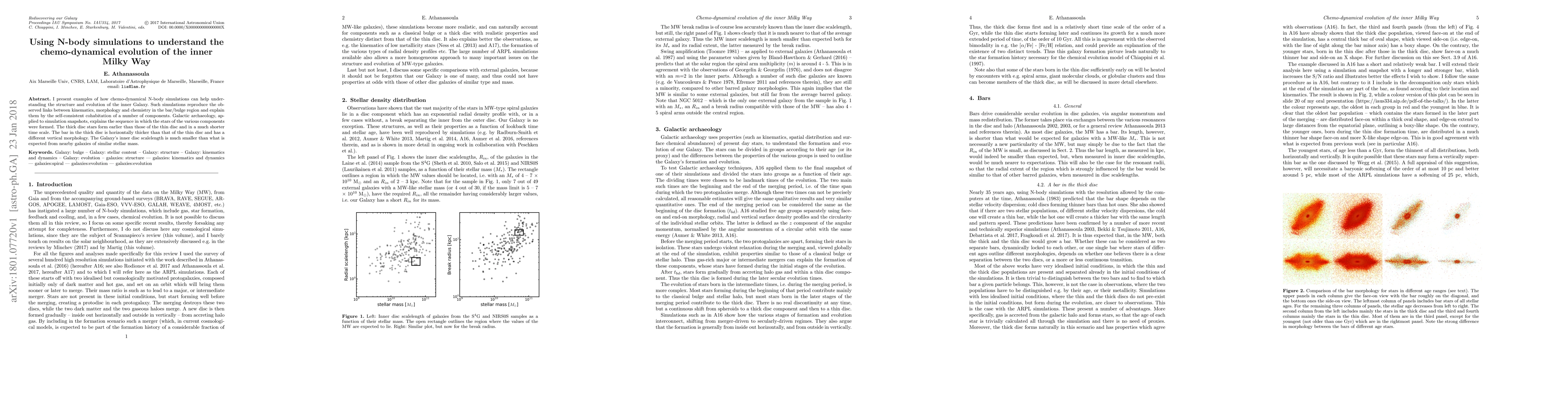I present examples of how chemo-dynamical N-body simulations can help understanding the structure and evolution of the inner Galaxy. Such simulations reproduce the observed links between kinematics, morphology and chemistry in the bar/bulge region and explain them by the self-consistent cohabitation of a number of components. Galactic archaeology, applied to simulation snapshots, explains the sequence in which the stars of the various components were formed. The thick disc stars form earlier than those of the thin disc and in a much shorter time scale. The bar in the thick disc is horizontally thicker than that of the thin disc and has a different vertical morphology. The Galaxy's inner disc scalelength is much smaller than what is expected from nearby galaxies of similar stellar mass.