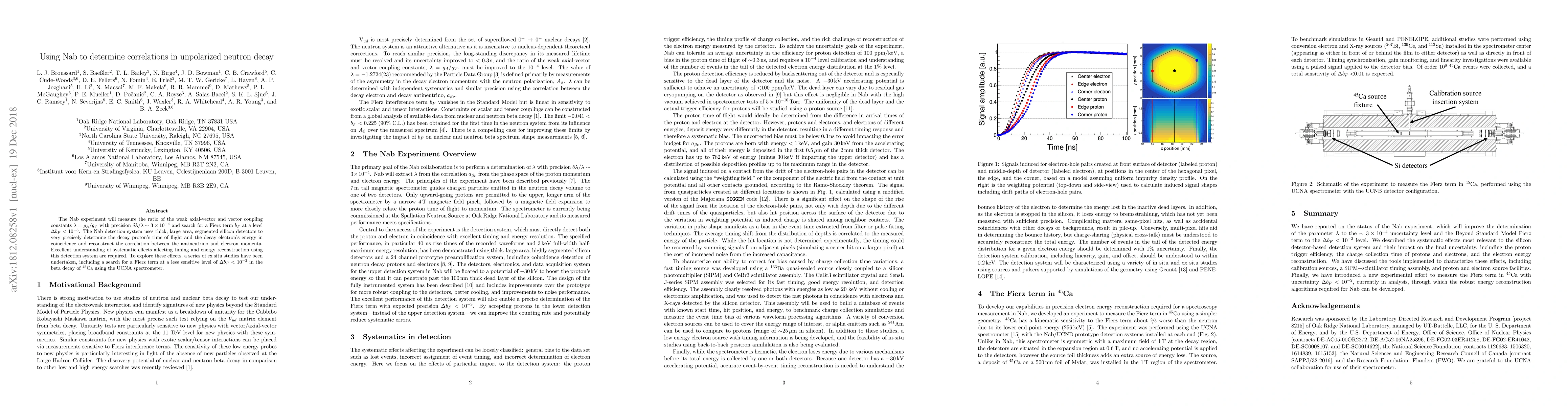 The Nab experiment aims to measure the weak axial-vector to vector coupling constant ratio with high precision and search for a Fierz term in neutron decay. The detection system uses segmented silicon detectors to precisely determine decay proton time of flight and electron energy, requiring detailed studies of systematic effects.