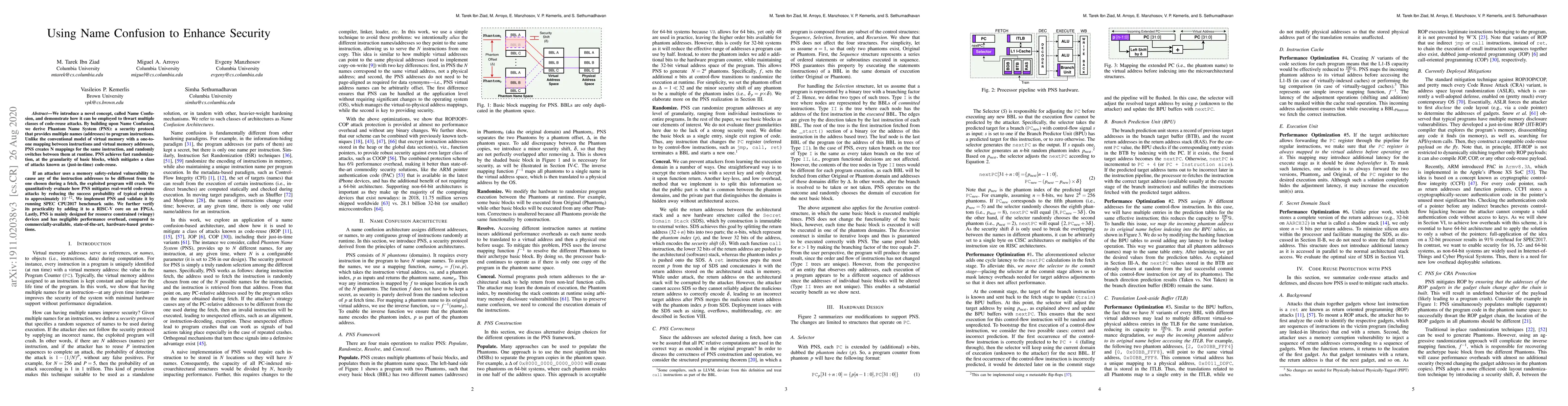 We introduce a novel concept, called Name Confusion, and demonstrate how it can be employed to thwart multiple classes of code-reuse attacks. By building upon Name Confusion, we derive Phantom Name System (PNS): a security protocol that provides multiple names (addresses) to program instructions. Unlike the conventional model of virtual memory with a one-to-one mapping between instructions and virtual memory addresses, PNS creates N mappings for the same instruction, and randomly switches between them at runtime. PNS achieves fast randomization, at the granularity of basic blocks, which mitigates a class of attacks known as (just-in-time) code-reuse. If an attacker uses a memory safety-related vulnerability to cause any of the instruction addresses to be different from the one chosen during a fetch, the exploited program will crash. We quantitatively evaluate how PNS mitigates real-world code-reuse attacks by reducing the success probability of typical exploits to approximately $10^{-12}$. We implement PNS and validate it by running SPEC CPU2017 benchmark suite. We further verify its practicality by adding it to a RISC-V core on an FPGA. Lastly, PNS is mainly designed for resource constrained (wimpy) devices and has negligible performance overhead, compared to commercially-available, state-of-the-art, hardware-based protections.