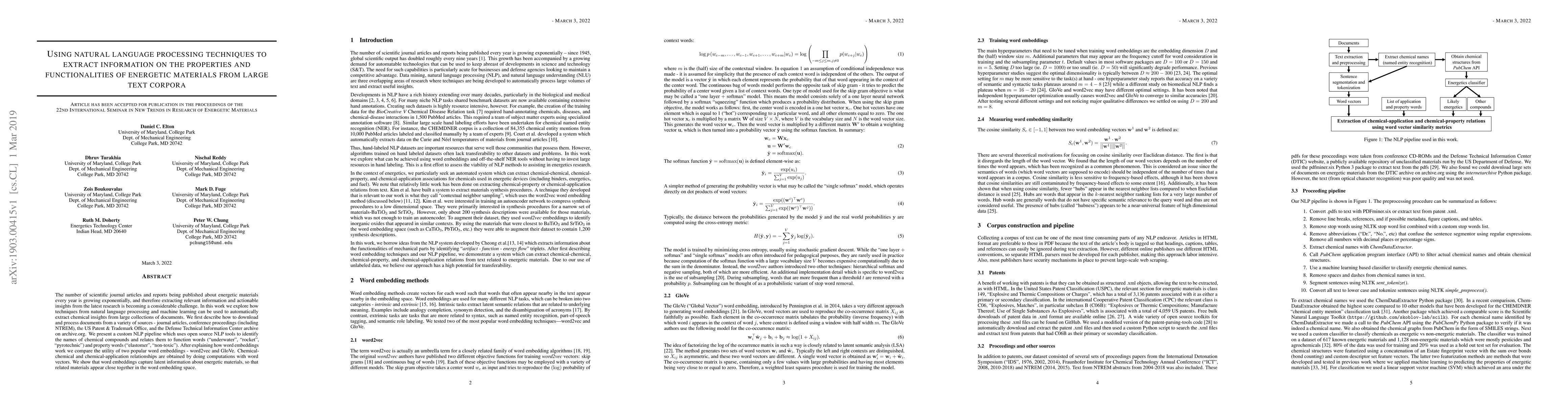 The number of scientific journal articles and reports being published about energetic materials every year is growing exponentially, and therefore extracting relevant information and actionable insights from the latest research is becoming a considerable challenge. In this work we explore how techniques from natural language processing and machine learning can be used to automatically extract chemical insights from large collections of documents. We first describe how to download and process documents from a variety of sources - journal articles, conference proceedings (including NTREM), the US Patent & Trademark Office, and the Defense Technical Information Center archive on archive.org. We present a custom NLP pipeline which uses open source NLP tools to identify the names of chemical compounds and relates them to function words ("underwater", "rocket", "pyrotechnic") and property words ("elastomer", "non-toxic"). After explaining how word embeddings work we compare the utility of two popular word embeddings - word2vec and GloVe. Chemical-chemical and chemical-application relationships are obtained by doing computations with word vectors. We show that word embeddings capture latent information about energetic materials, so that related materials appear close together in the word embedding space.