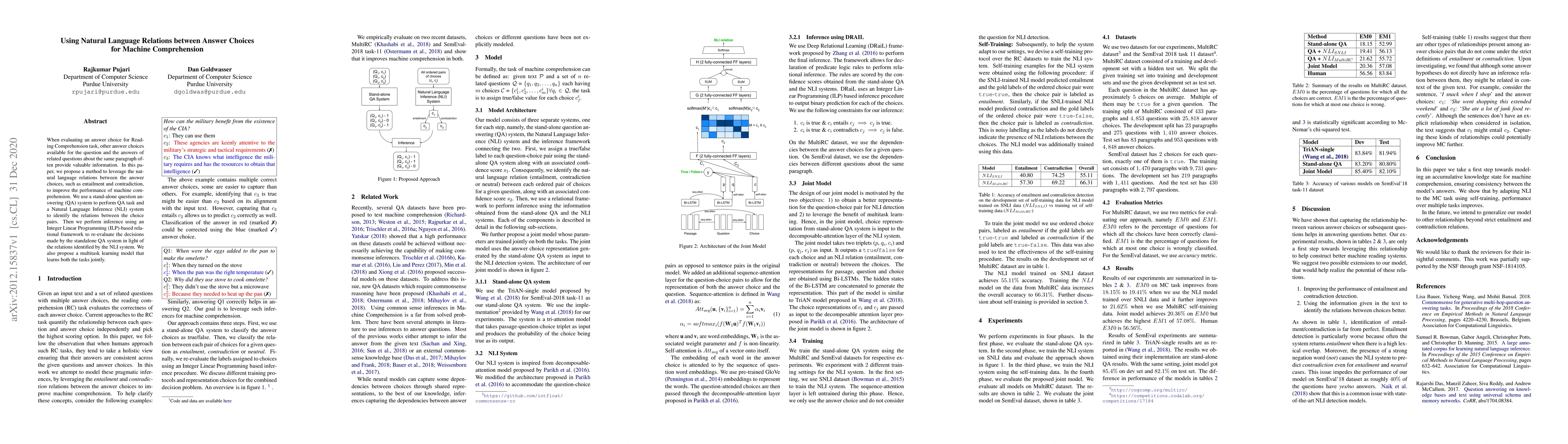 This paper proposes a method to enhance machine comprehension by leveraging natural language relations between answer choices, using a QA system and an NLI system to identify these relations and an ILP-based framework to re-evaluate decisions, alongside a multitask learning model for joint task optimization.