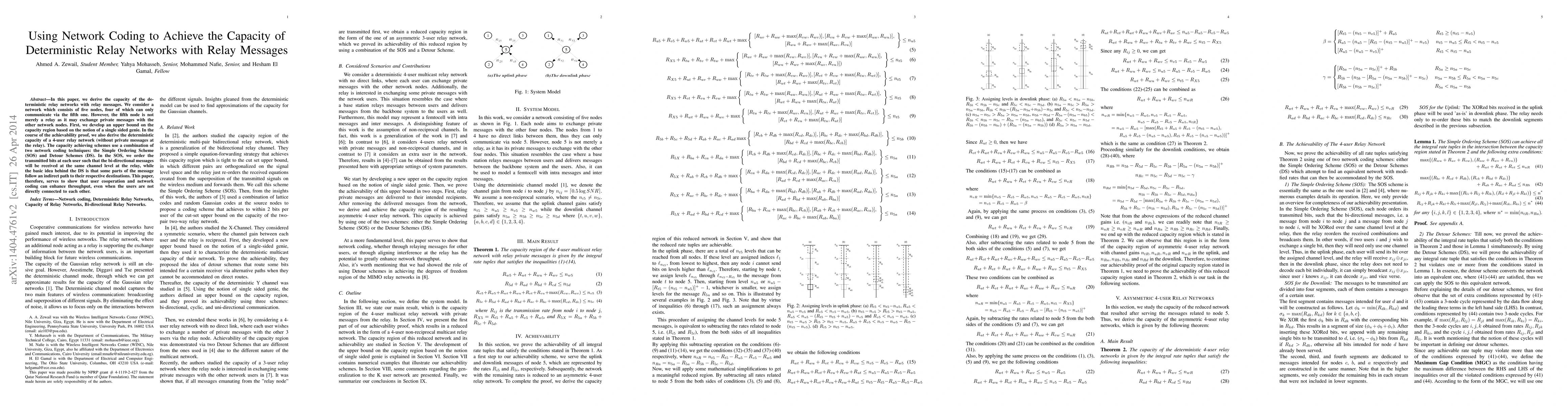 This paper derives the capacity of deterministic relay networks using network coding techniques, specifically the Simple Ordering Scheme (SOS) and Detour Schemes (DS), to enhance throughput in a five-node network where four nodes communicate via a central relay that can also exchange private messages.