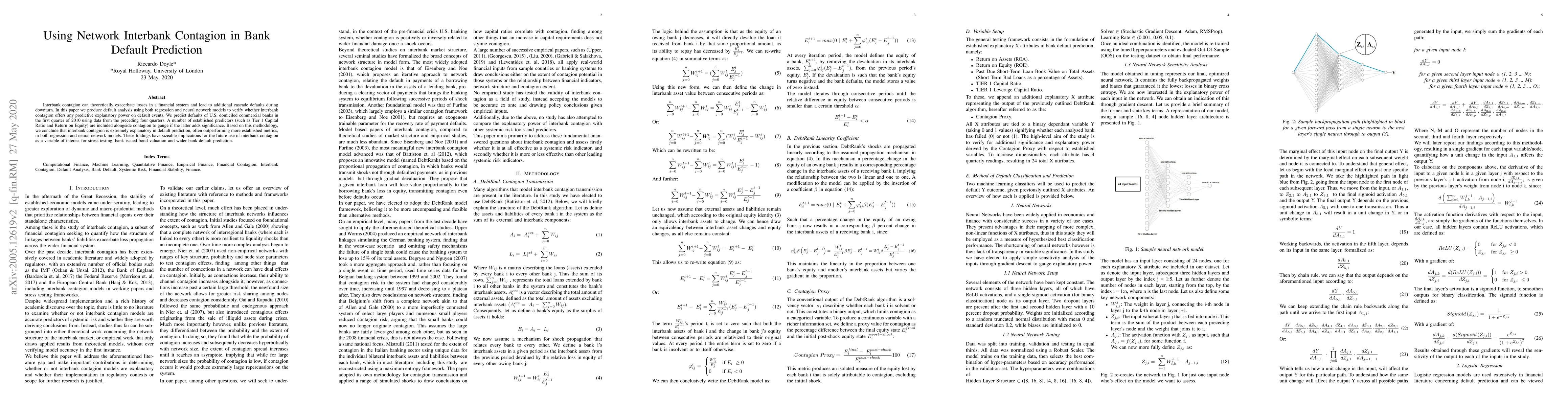 A novel approach to analyzing interbank contagion using machine learning techniques, demonstrating its potential as a valuable metric in bank default analysis.
