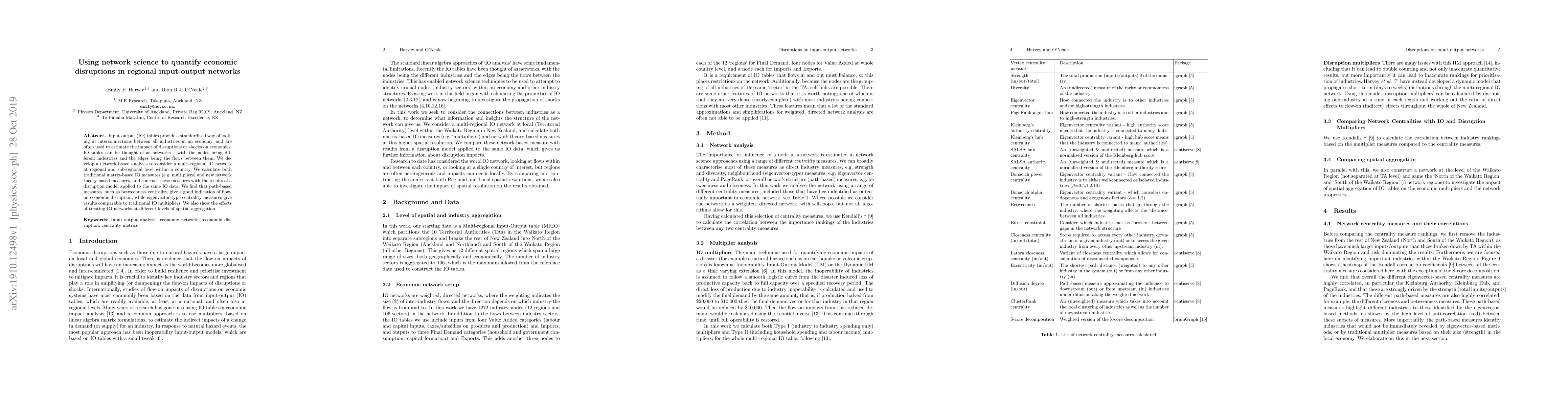 This paper uses network science to analyze economic disruptions in multi-regional input-output networks, comparing traditional IO measures with network theory-based measures like betweenness centrality, which indicates economic disruption flow, and eigenvector centrality, which aligns with traditional IO multipliers. The study also examines the effects of different spatial aggregation levels.