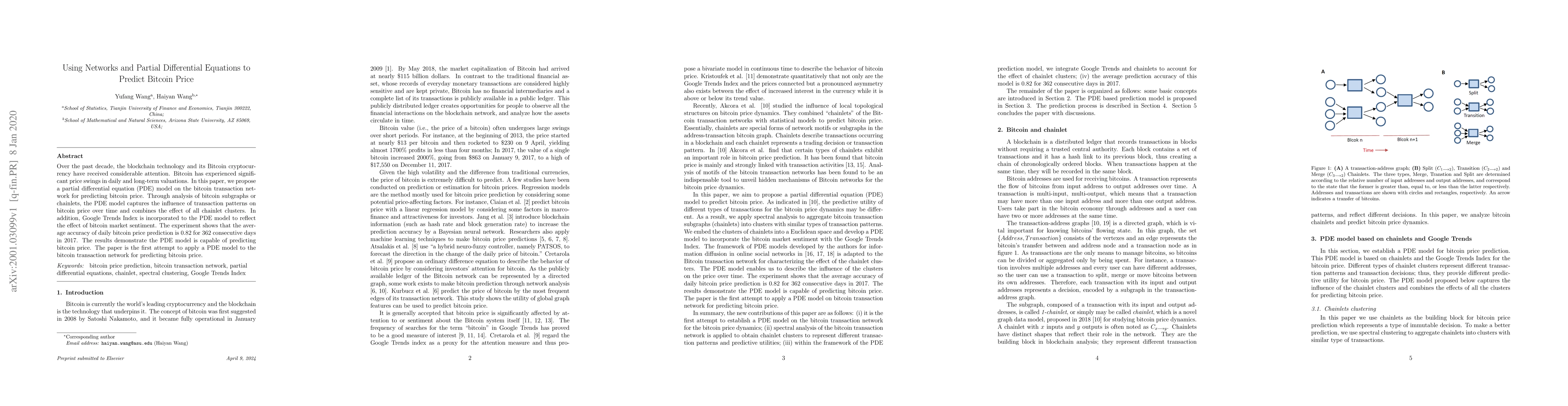 This paper proposes a novel partial differential equation (PDE) model to predict Bitcoin price by analyzing transaction networks and incorporating Google Trends Index to reflect market sentiment. The model's accuracy in predicting daily Bitcoin prices over 362 days in 2017 averaged at 0.82, demonstrating its effectiveness.
