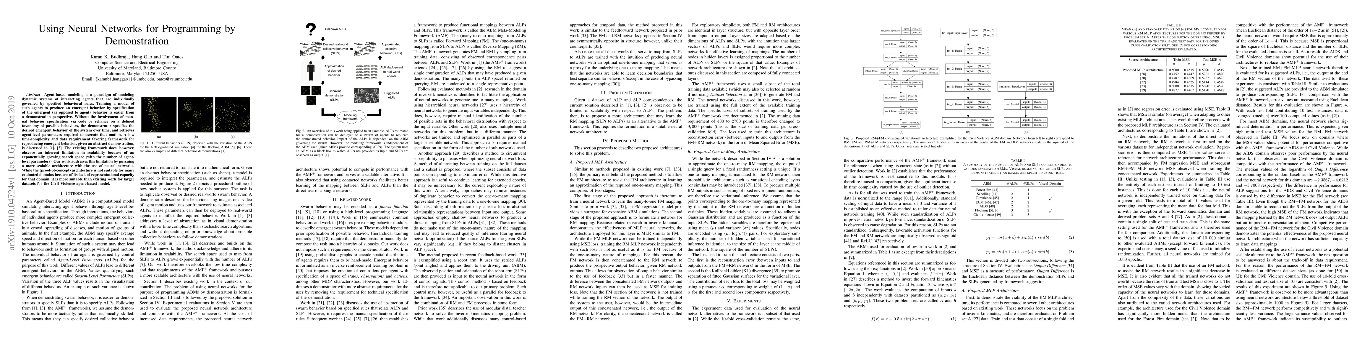 Agent-based modeling is a paradigm of modeling dynamic systems of interacting agents that are individually governed by specified behavioral rules. Training a model of such agents to produce an emergent behavior by specification of the emergent (as opposed to agent) behavior is easier from a demonstration perspective. Without the involvement of manual behavior specification via code or reliance on a defined taxonomy of possible behaviors, the demonstrator specifies the desired emergent behavior of the system over time, and retrieves agent-level parameters required to execute that motion. A low time-complexity and data requirement favoring framework for reproducing emergent behavior, given an abstract demonstration, is discussed in [1], [2]. The existing framework does, however, observe an inherent limitation in scalability because of an exponentially growing search space (with the number of agent-level parameters). Our work addresses this limitation by pursuing a more scalable architecture with the use of neural networks. While the (proof-of-concept) architecture is not suitable for many evaluated domains because of its lack of representational capacity for that domain, it is more suitable than existing work for larger datasets for the Civil Violence agent-based model.