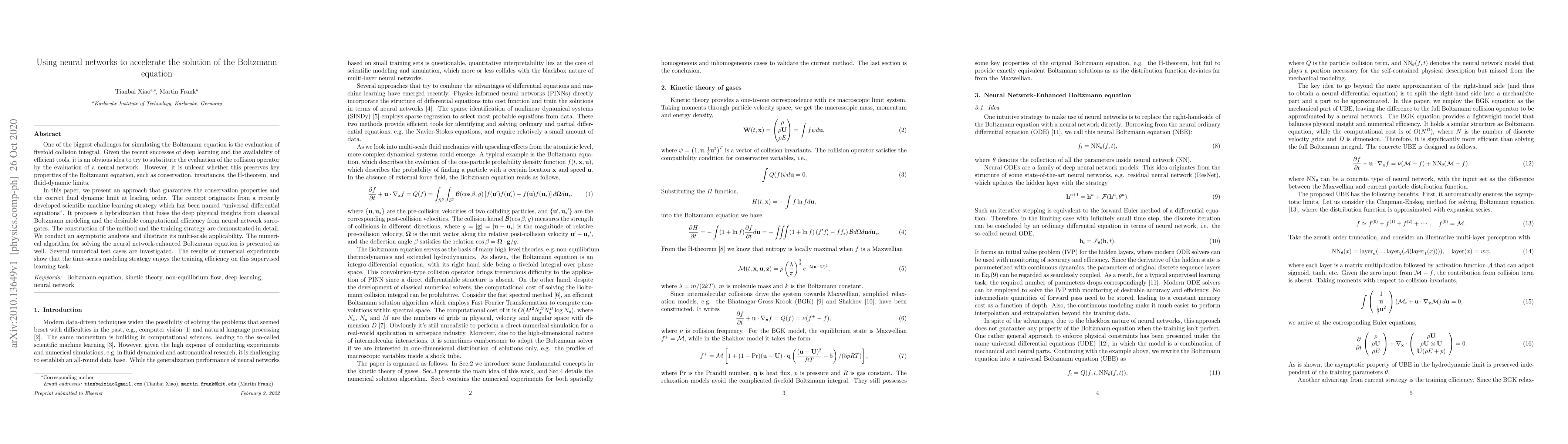This paper proposes a neural network-based approach to accelerate the solution of the Boltzmann equation by substituting the computationally intensive fivefold collision integral with a neural network. The method ensures conservation properties and fluid-dynamic limits, leveraging a "universal differential equations" strategy to combine deep physical insights with computational efficiency.