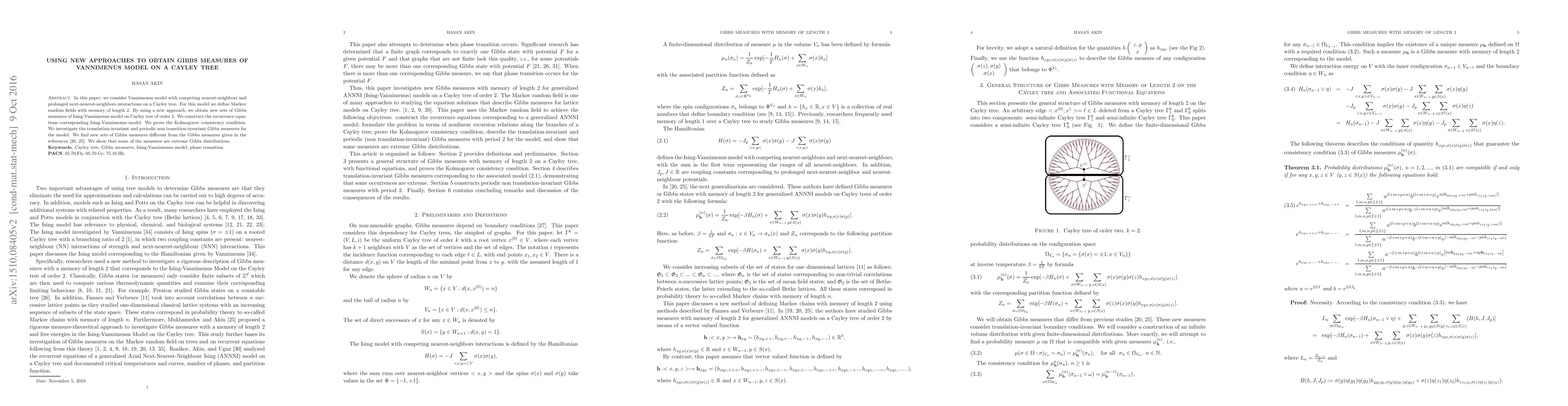 This paper introduces a novel method to derive Gibbs measures for the Vannimenus model on a Cayley tree, focusing on competing interactions. It defines Markov random fields with memory and constructs recurrence equations, proving the Kolmogorov consistency condition and identifying new translation-invariant and non-translation-invariant Gibbs measures, some of which are extreme distributions.